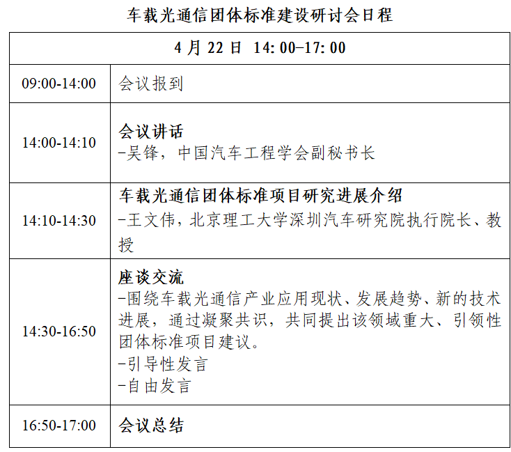 4月22日,中国汽车工程学会联合电动汽车产业技术创新战略联盟聚焦车载光通信团体标准建设召开研讨会,诚邀整车企业、零部件企业、科研院校及检测认证机构等专家代表参会,具体事项如下: