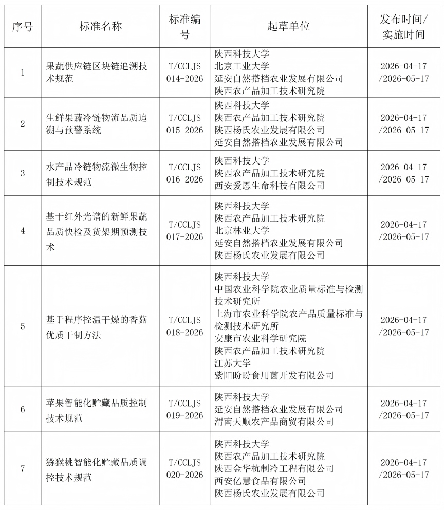 江苏省冷链学会关于发布《生鲜果蔬冷链物流品质追溯与预警系统》等7项团体标准的公告