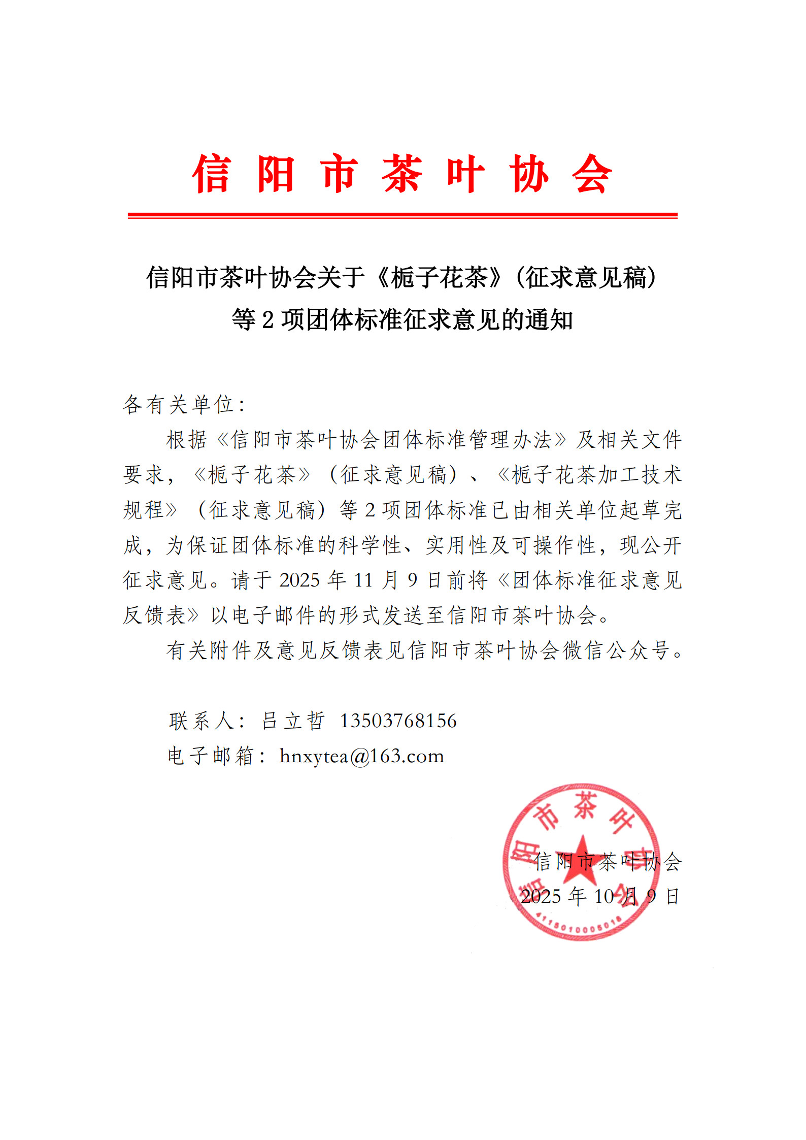 各有关单位: 根据《信阳市茶叶协会团体标准管理办法》及相关文件要求,《栀子花茶》(征求意见稿)、《栀子花茶加工技术规程》(征求意见稿)2项团体标准已由相关单位起草完成,为保证团体标准的科学性、实用性及可操作性,现公开征求意见。请于2025年11月9日前将《团体标准征求意见反馈表》以电子邮件的形式发送至信阳市茶叶协会。 有关附件及意见反馈表见信阳市茶叶协会微信公众号。 联系人:吕立哲 13503768156 电子邮箱:hnxytea@163.com
