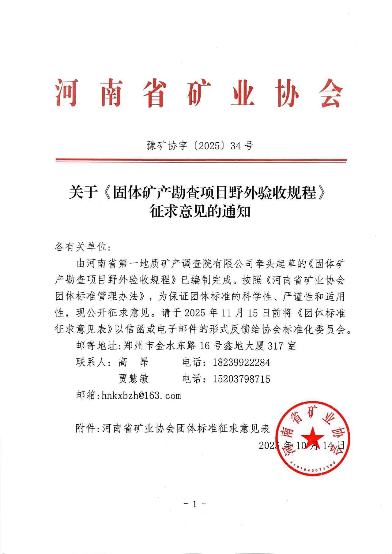各有关单位: 由河南省第一地质矿产调查院有限公司牵头起草的《固体矿产勘查项目野外验收规程》已编制完成。按照《河南省矿业协会团体标准管理法》,为保证团体标准的科学性、严谨性和适用性,现公开征求意见。请于2025年11月15日前将《团体标准征求意见表》以信函或电子邮件的形式反馈给协会标准化委员会。 邮寄地址:郑州市金水东路16号鑫地大厦317室 联系人:高昂 电话:18239922284 贾慧敏 电话:15203798715 邮箱:hnkxbzh@163.com