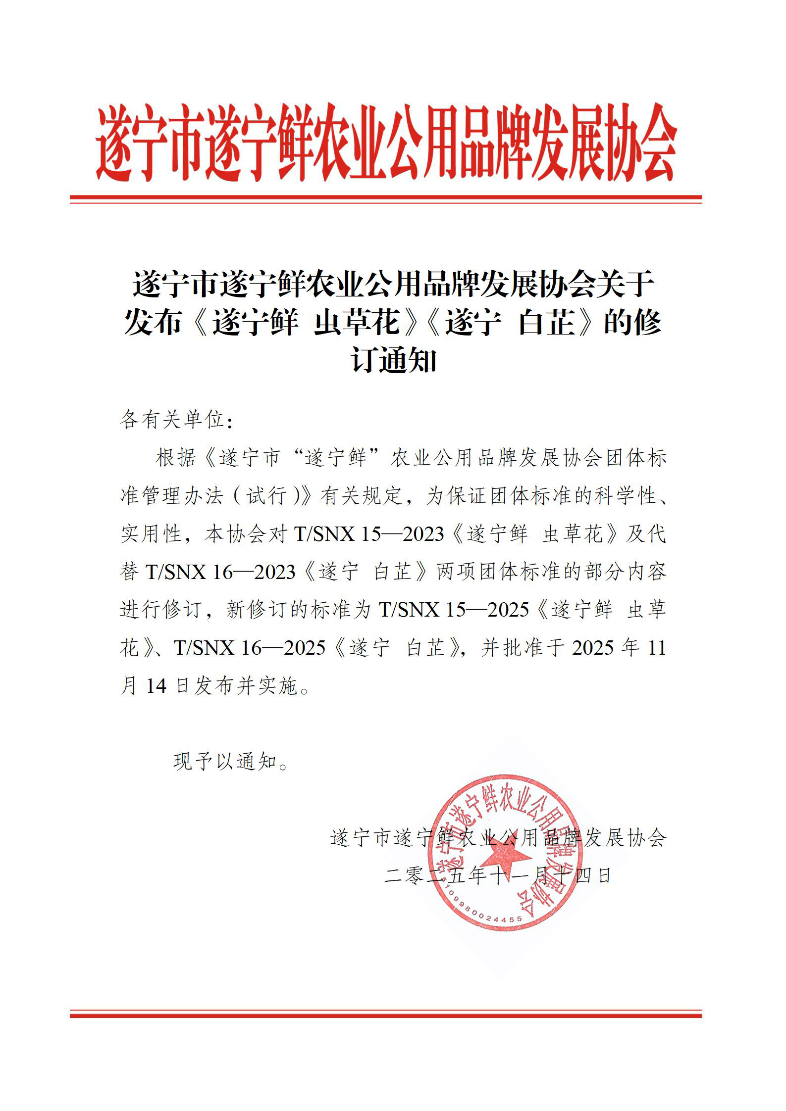 各有关单位: 根据《遂宁市“遂宁鲜”农业公用品牌发展协会团体标准管理办法(试行)》有关规定,为保证团体标准的科学性、实用性,本协会对T/SNX 15—2023《遂宁鲜 虫草花》及代替T/SNX 16—2023《遂宁 白芷》两项团体标准的部分内容进行修订,新修订的标准为T/SNX 15—2025《遂宁鲜 虫草花》、T/SNX 16—2025《遂宁 白芷》,并批准于2025年11月14日发布并实施。