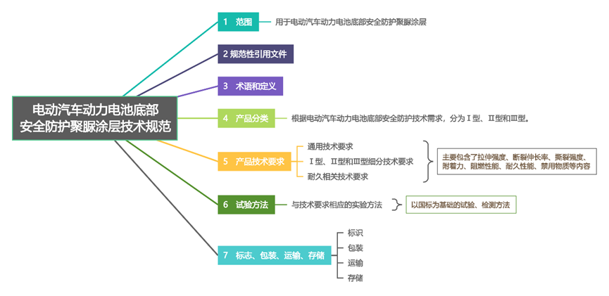 随着新能源汽车产业的迅猛发展,电动汽车的保有量持续攀升;动力电池作为电动电动汽车动力电池底部安全防护聚脲涂层技术规范汽车的核心能量源,通常安装在车辆底部,在行驶过程中难免要直面复杂多变的路面环境,极易受到路面异物撞击、刮擦,进而产生电池短路、起火等风险,对用户生命财产安全构成极大威胁。目前诸多企业已通过在动力电池底部增加防护涂层的方式实现电池安全性能的提升,聚脲涂层具有优异的防腐、抗冲击性能受到市场欢迎。但行业内存在相关防护涂层技术指标缺乏统一标准、测试方法不统一等问题,影响涂层产品质量及产业化应用。制定《电动汽车动力电池底部安全防护聚脲涂层技术规范》旨在规范防护聚脲涂层的技术要求、性能指标及测试方法,为企业生产提供明确技术指导,保障电动汽车底部安全防护涂层质量,降低安全事故发生率,助力电池防护涂层的技术创新和电池安全防护性能提升。 本标准规定了电动汽车动力电池底部安全防护聚脲涂层的分类、技术要求、试验方法等内容。将防护涂层技术要求分为Ⅰ、Ⅱ、Ⅲ型,并细化指标。技术要求主要包含了拉伸强度、断裂伸长率、撕裂强度、附着力、阻燃性能、耐久性能、禁用物质等内容;试验方法主要参考涂层相关试验方法标准。