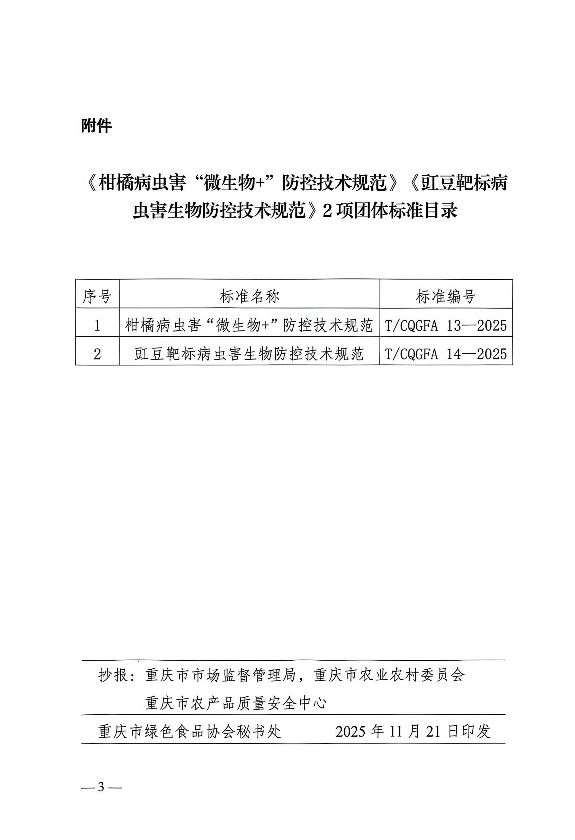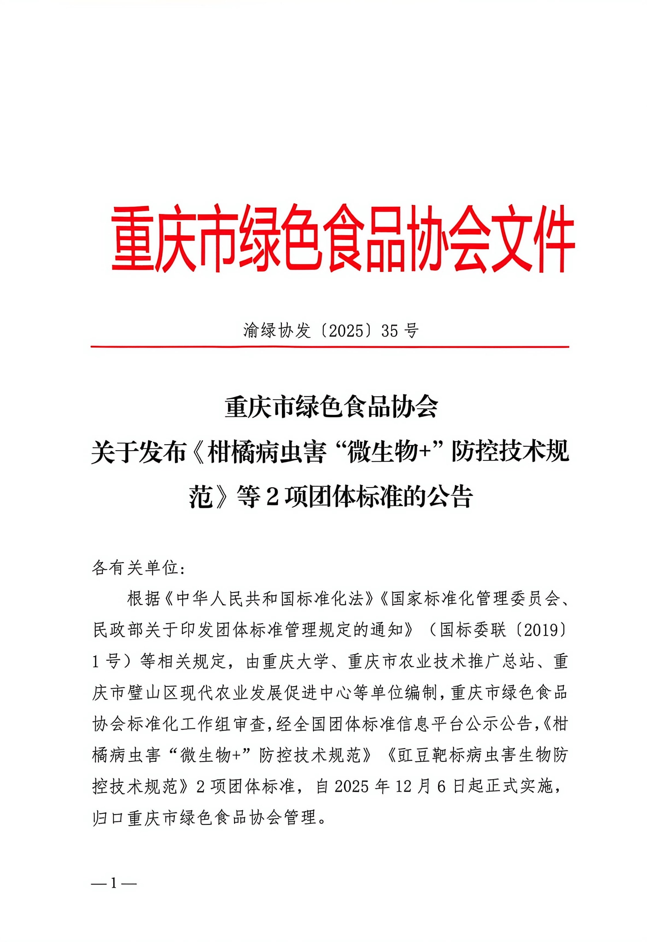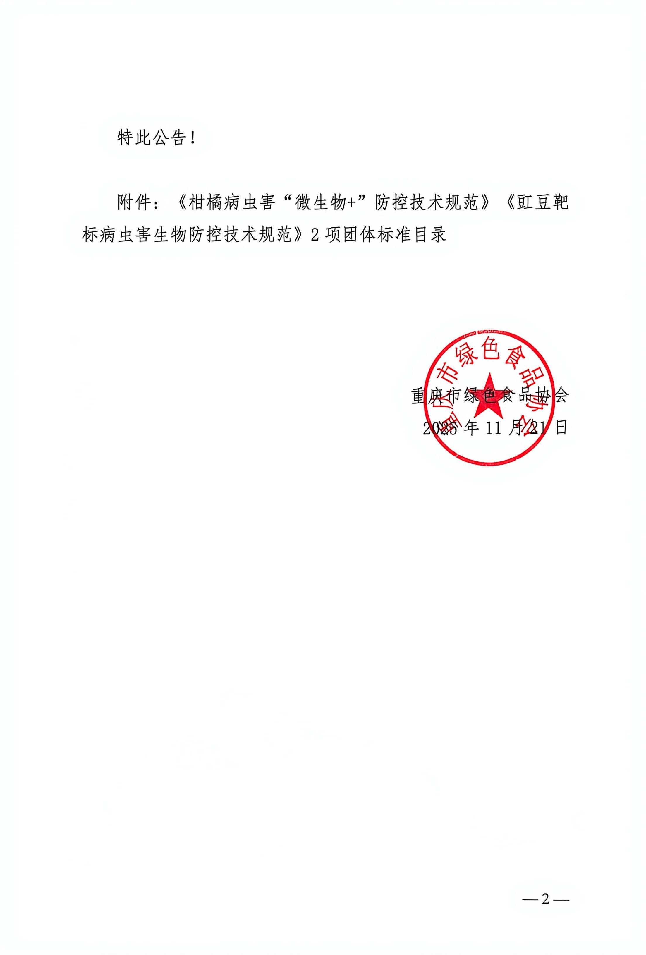各有关单位: 根据《中华人民共和国标准化法》《国家标准化管理委员会、民政部关于印发团体标准管理规定的通知》(国标委联〔2019〕1号)等相关规定,由重庆大学、重庆市农业技术推广总站、重庆市璧山区现代农业发展促进中心等单位编制,重庆市绿色食品协会标准化工作组审查,经全国团体标准信息平台公示公告,《柑橘病虫害“微生物+”防控技术规范》《豇豆靶标病虫害生物防控技术规范》2项团体标准,自2025年12月6日起正式实施,归口重庆市绿色食品协会管理。 特此公告!
