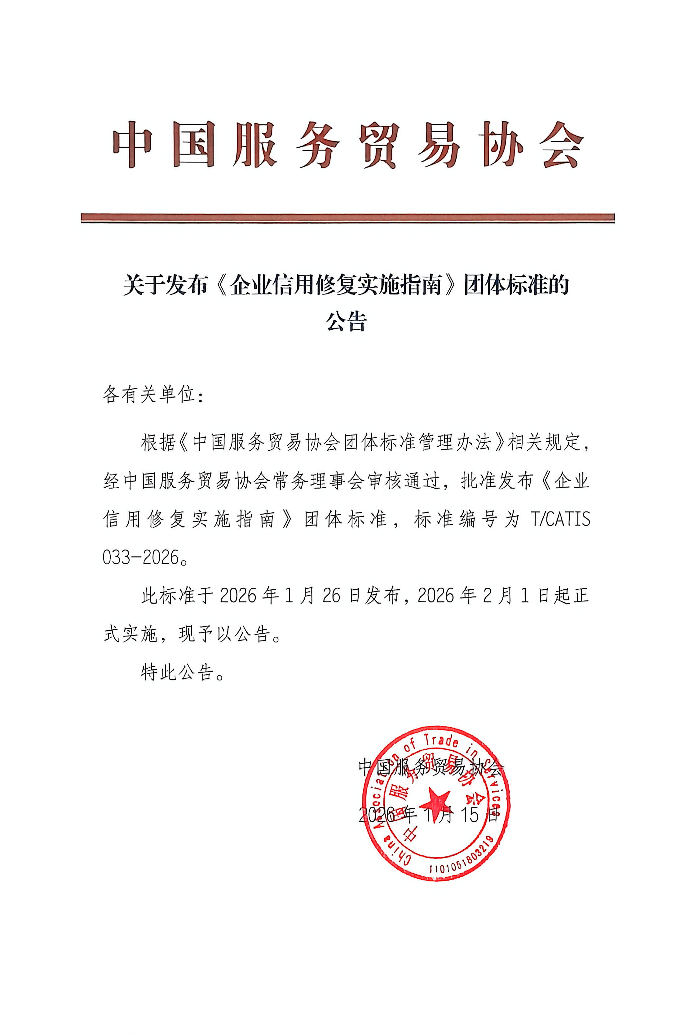各有关单位: 根据《中国服务贸易协会团体标准管理办法》相关规定,经中国服务贸易协会常务理事会审核通过,批准发布《企业信用修复实施指南》团体标准,标准编号为T/CATIS 033-2026。 此标准于2026年1月26日发布,2026年2月1日起正式实施,现予以公告。 特此公告。