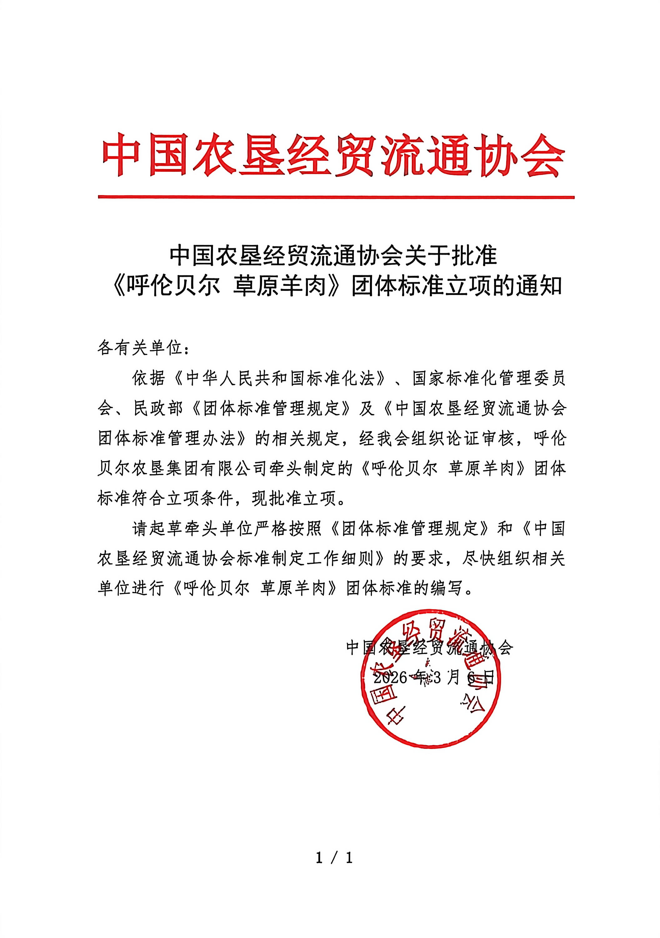 各有关单位: 依据《中华人民共和国标准化法》、国家标准化管理委员会、民政部《团体标准管理规定》及《中国农垦经贸流通协会团体标准管理办法》的相关规定,经我会组织论证审核,呼伦贝尔农垦集团有限公司牵头制定的《呼伦贝尔 草原羊肉》团体标准符合立项条件,现批准立项。 请起草牵头单位严格按照《团体标准管理规定》和《中国农垦经贸流通协会标准制定工作细则》的要求,尽快组织相关单位进行《呼伦贝尔 草原羊肉》团体标准的编写。 中国农垦经贸流通协会 2026年3月6日 |