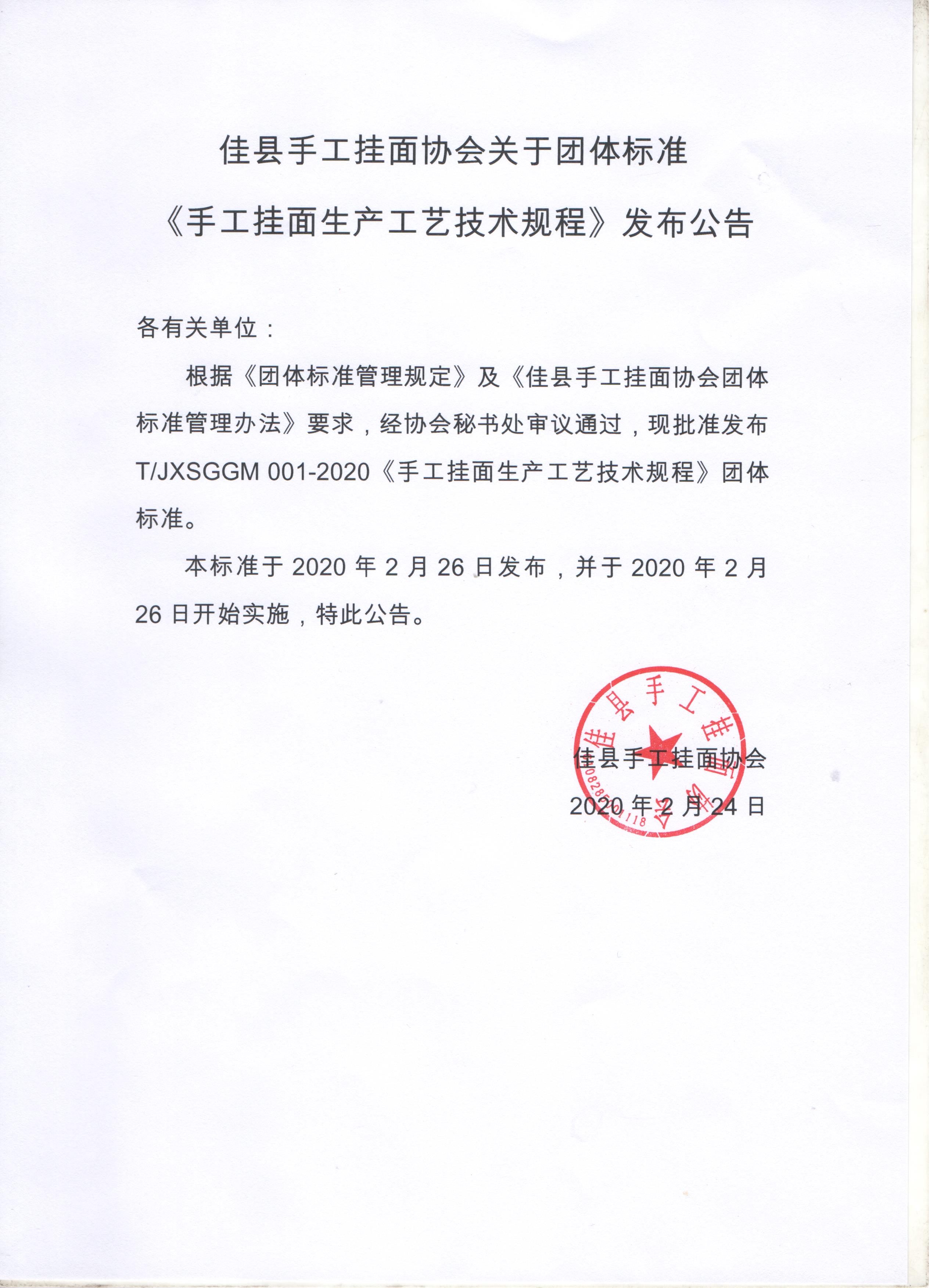 各有关单位: 根据《团体标准管理规定》及《佳县手工挂面协会团体标准管理办法》要求,经协会秘书处审议通过,现批准发布T/JXSGGM 001-2020《手工挂面生产工艺技术规程》团体标准。 本标准于2020年2月26日发布,并于2020年2月26日开始实施,特此公告。