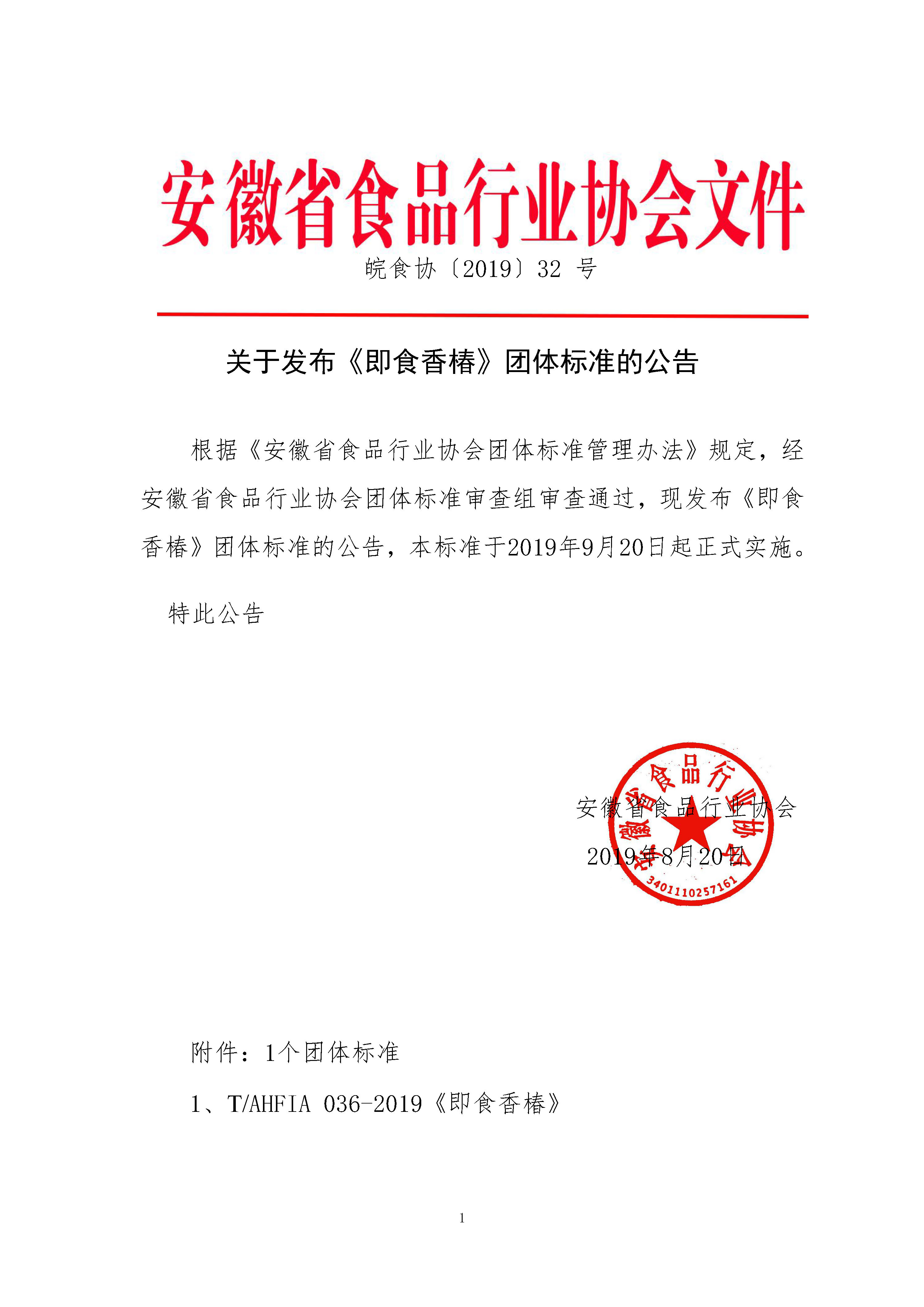 各有关单位: 根据《安徽省食品行业协会团体标准管理办法》规定,经安徽省食品行业协会团体标准审查组审查通过,现发布《即食香椿》团体标准的公告,标准编号为:T/AHFIA 036-2019《即食香椿》,本标准于2019年9月20日起正式实施。 特此公告