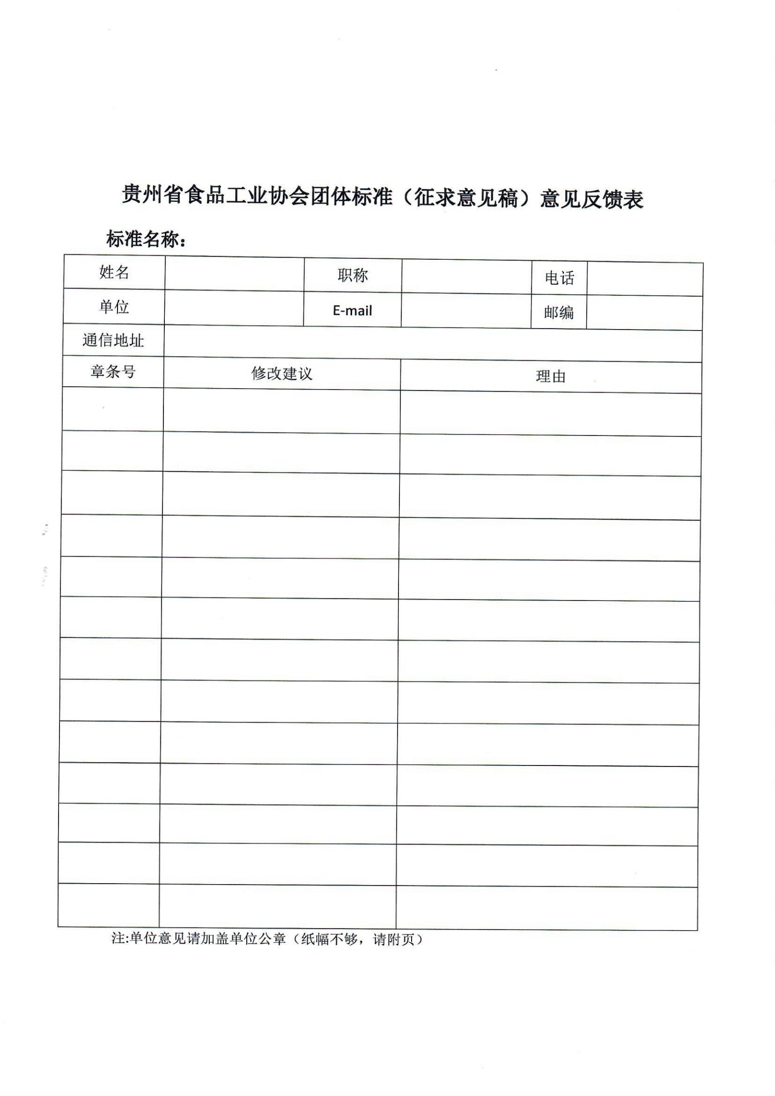 各相关单位: 根据贵州省食品工业协会对《醪糟》团体标准立项的批复,按照贵州省食品工业协会对《醪糟》团体标准制定工作要求,由贵州省产品质量检验检验院、毕节彝姑娘特色食品开发有限公司、贵州亿香醇酒业有限公司联合起草的团体标准《醪糟》已经完成征求意见稿。 按照贵州省食品工业协会团体标准管理办法的规定,现向有关行业部门、协会、生产、销售、科研、检测和用户等单位广泛征求意见。请按照附件格式填写意见反馈表,并于2020年10月23日前以邮件或传真方式反馈至秘书处。若没有意见也请返回,未返回视为无意见。 联系人:寻思颖 杨世尧 电话:18985190633 E-mail:1311141958@qq.com 邮编:550004 地址:贵阳市北京路202号京瑞宾馆5楼