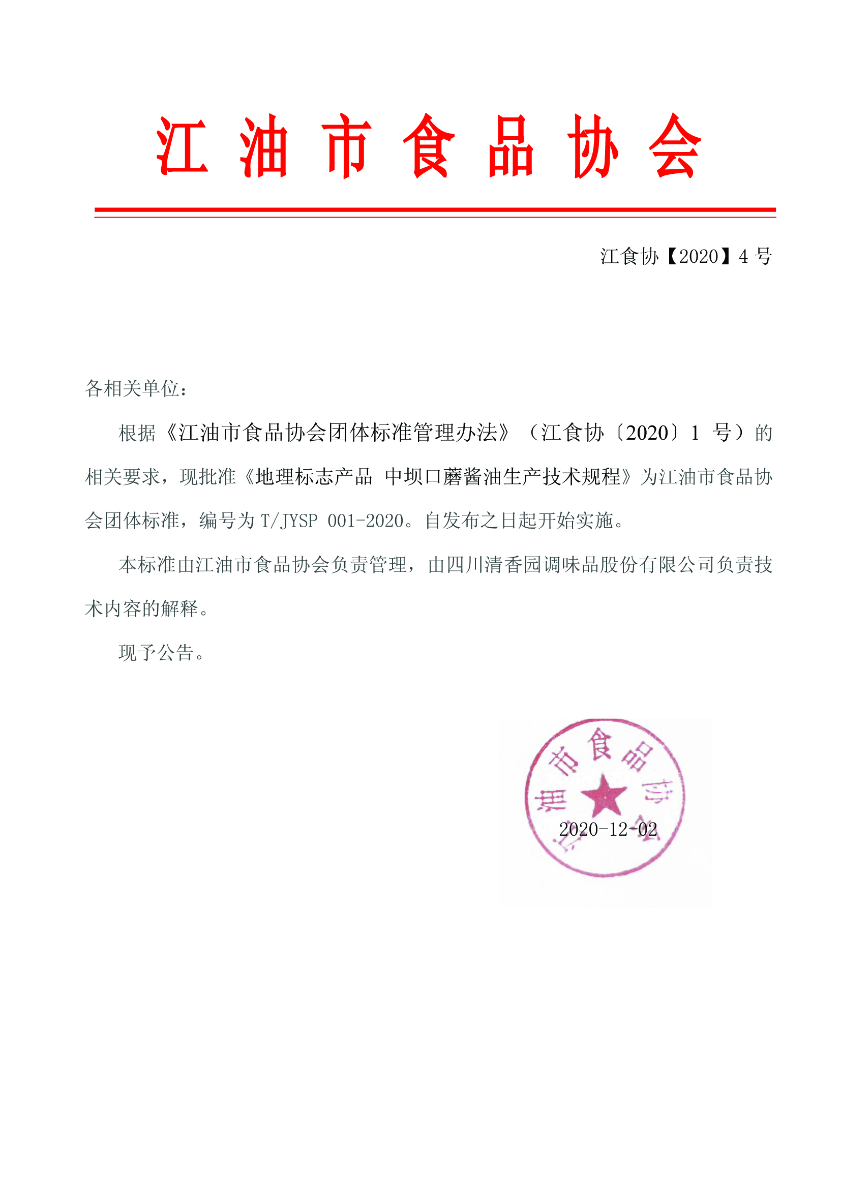 各相关单位: 根据《江油市食品协会团体标准管理办法》(江食协〔2020〕1 号)的相关要求,现批准《地理标志产品 中坝口蘑酱油生产技术规程》为江油市食品协会团体标准,编号为T/JYSP 001-2020。自发布之日起开始实施。 本标准由江油市食品协会负责管理,由四川清香园调味品股份有限公司负责技术内容的解释。 现予公告。 2020-12-02 |