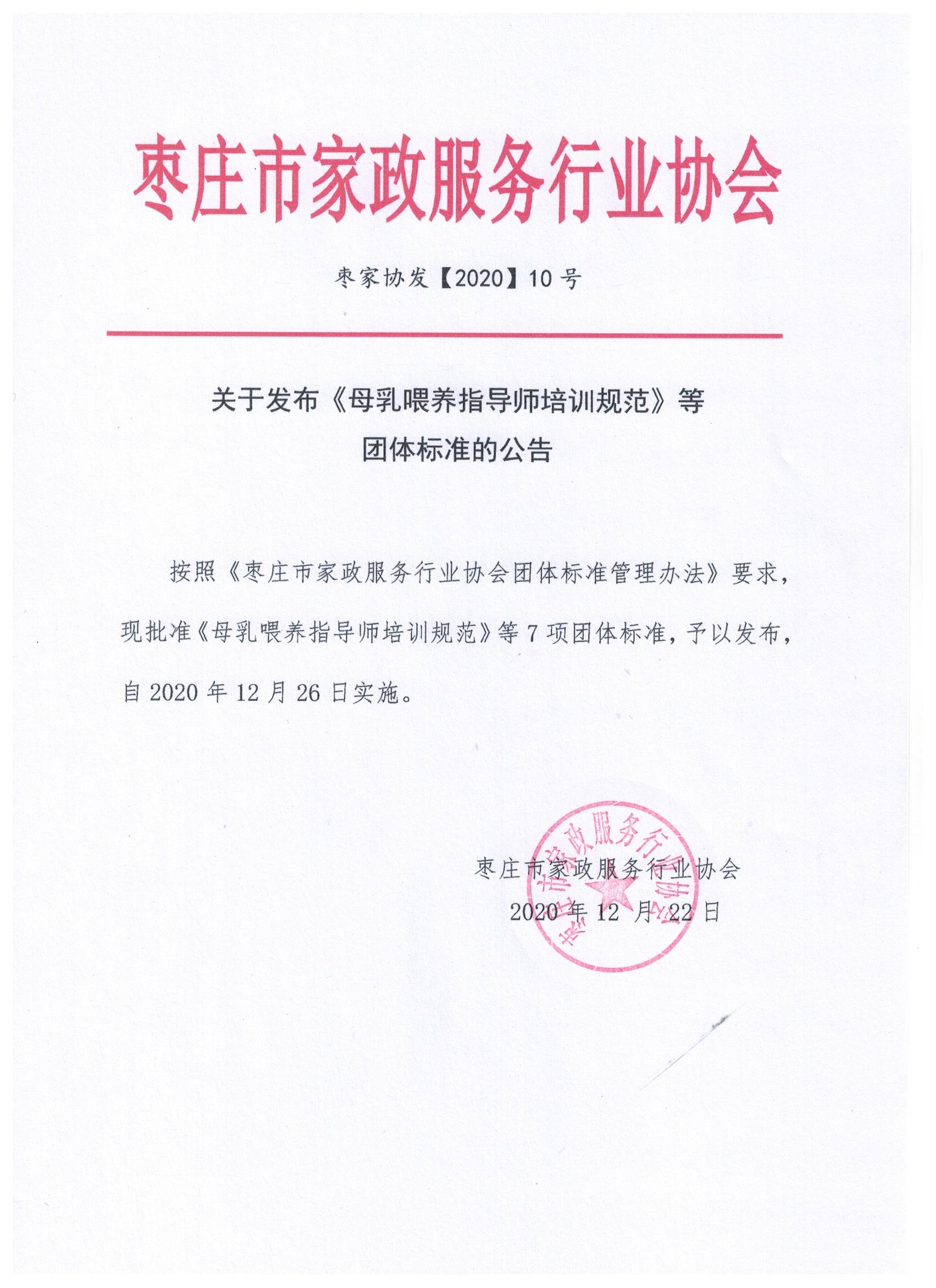 按照《枣庄市家政服务行业协会团体标准管理办法》要求,现批准《母乳喂养指导师培训规范》等7项团体标准,予以发布,自2020年12月26日实施。
