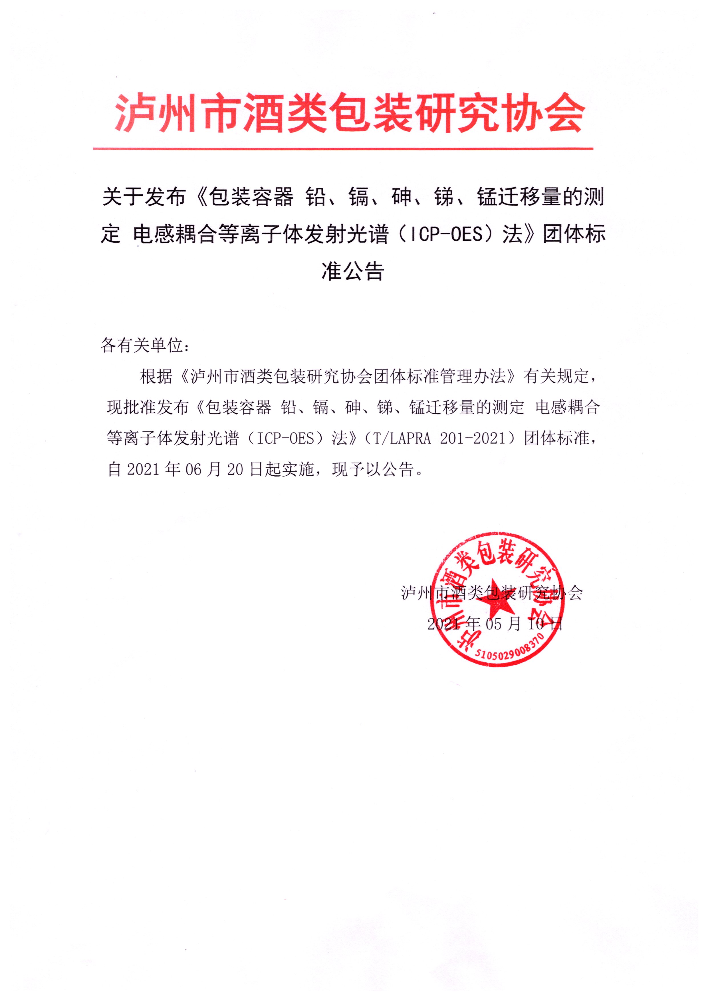 各有关单位: 根据《泸州市酒类包装研究协会团体标准管理办法》有关规定,现批准发布《包装容器 铅、镉、砷、锑、锰迁移量的测定 电感耦合等离子体发射光谱(ICP-OES)法》(T/LAPRA 201-2021)团体标准,自2021年06月20日起实施,现予以公告。 泸州市酒类包装研究协会 2021年05月10日