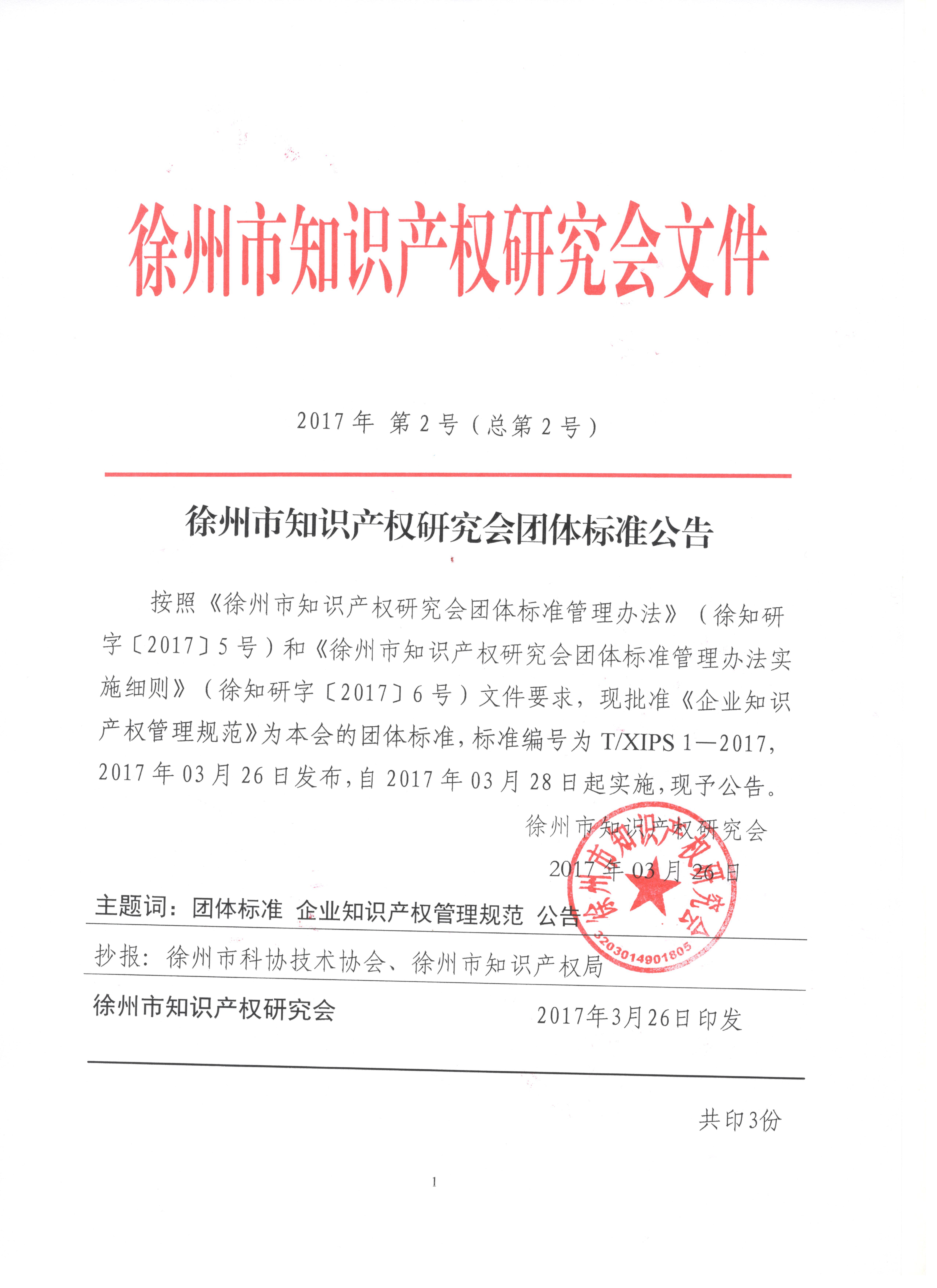 按照《徐州市知识产权研究会团体标准管理办法》(徐知研字〔2017〕5号)和《徐州市知识产权研究会团体标准管理办法实施细则》(徐知研字〔2017〕6号)文件要求,现批准《企业知识产权管理规范》为本会的团体标准,标准编号为T/XIPS 1—2017, 2017年03月26日发布,自2017年03月28日起实施,现予公告。 徐州市知识产权研究会 2017年03月26日 |