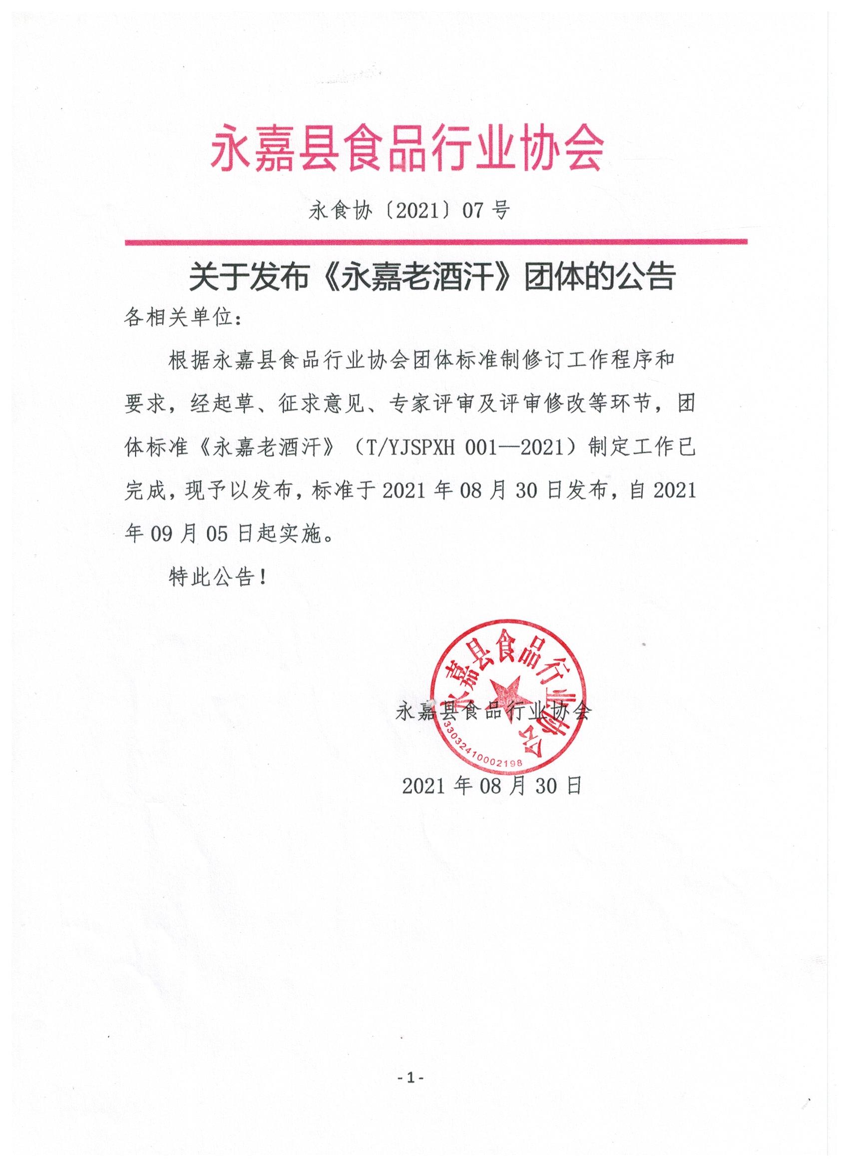各相关单位: 根据永嘉县食品行业协会团体标准制修订工作程序和要求,经起草、征求意见、专家评审及评审修改等环节,团体标准《永嘉老酒汗》(T/YJSPXH 001—2021)制定工作已完成,现予以发布,标准于2021年08月30日发布,自2021年09月05日起实施。 特此公告!
