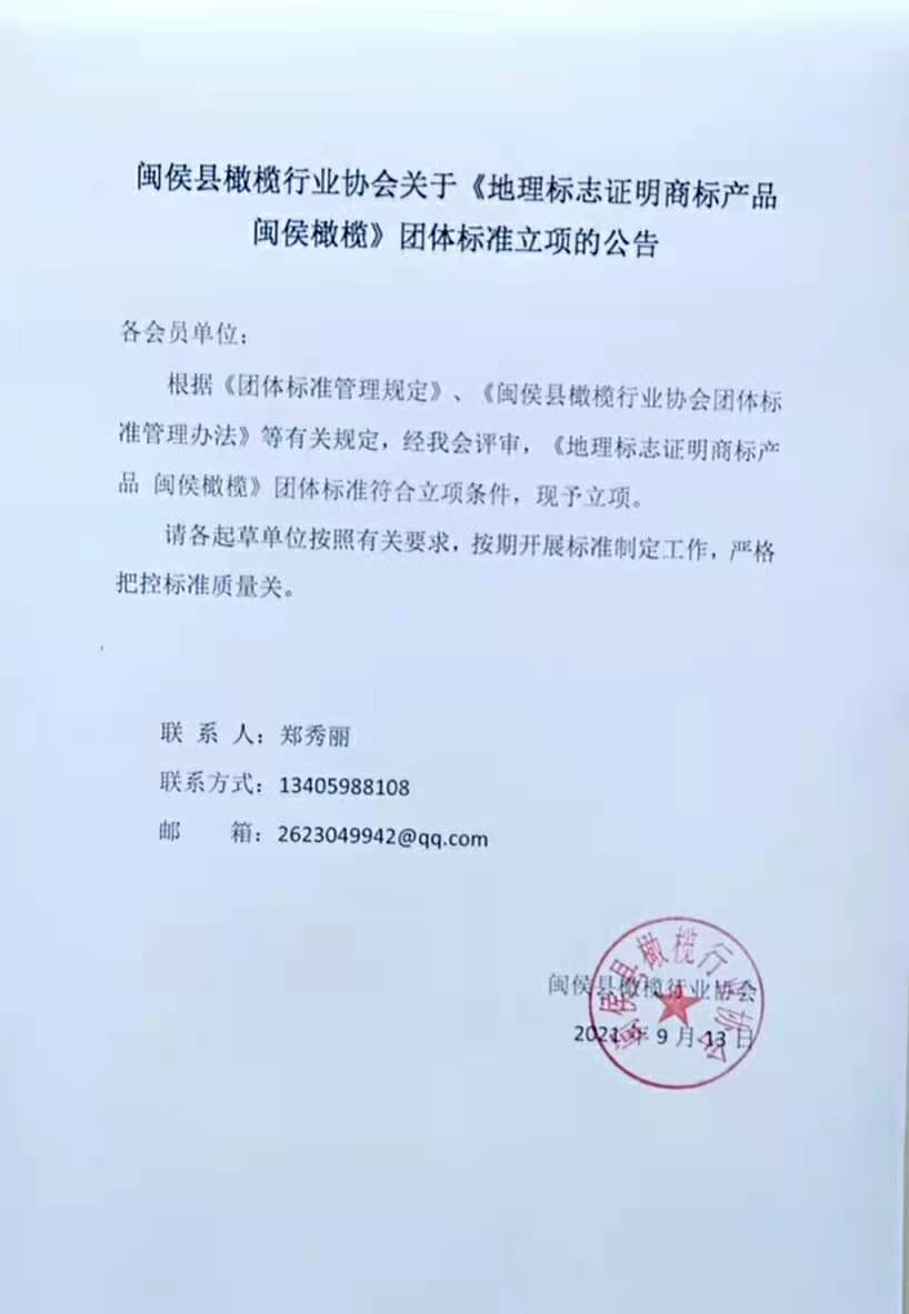 根据《团体标准管理规定》、《闽侯县橄榄行业协会团体标准管理办法》等有关规定,经我会评审,《地理标志证明商标产品 闽侯橄榄》团体标准符合立项条件,现予立项。 请各起草单位按照有关要求,按期开展标准制定工作,严格把控标准质量关。 联 系 人:郑秀丽 联系方式:13405988108 邮 箱:2623049942@qq.com