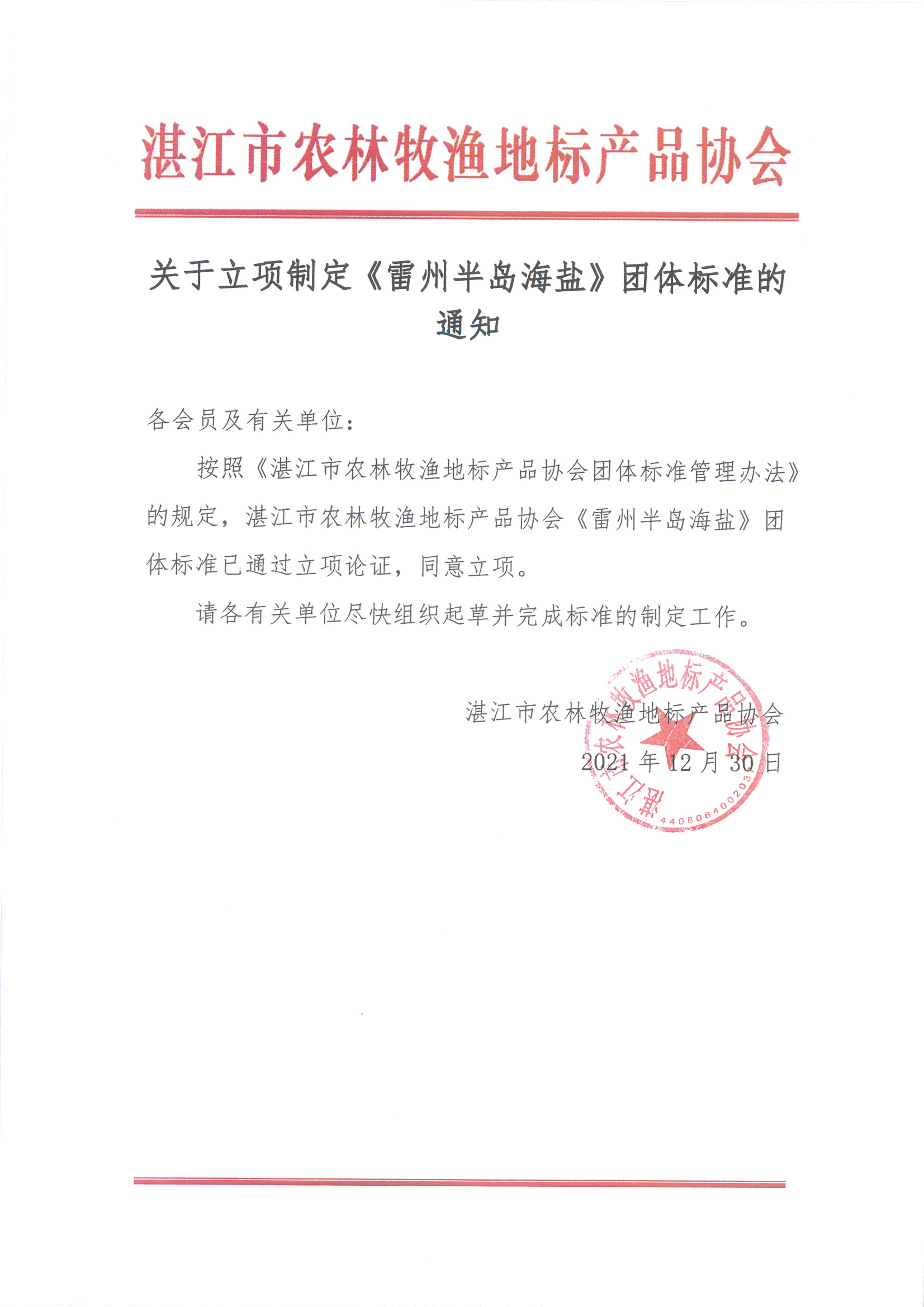 各会员及有关单位: 按照《湛江市农林牧渔地标产品协会团体标准管理办法》的规定,湛江市农林牧渔地标产品协会《雷州半岛海盐》团体标准已通过立项论证,同意立项。 请各有关单位尽快组织起草并完成标准的制定工作。