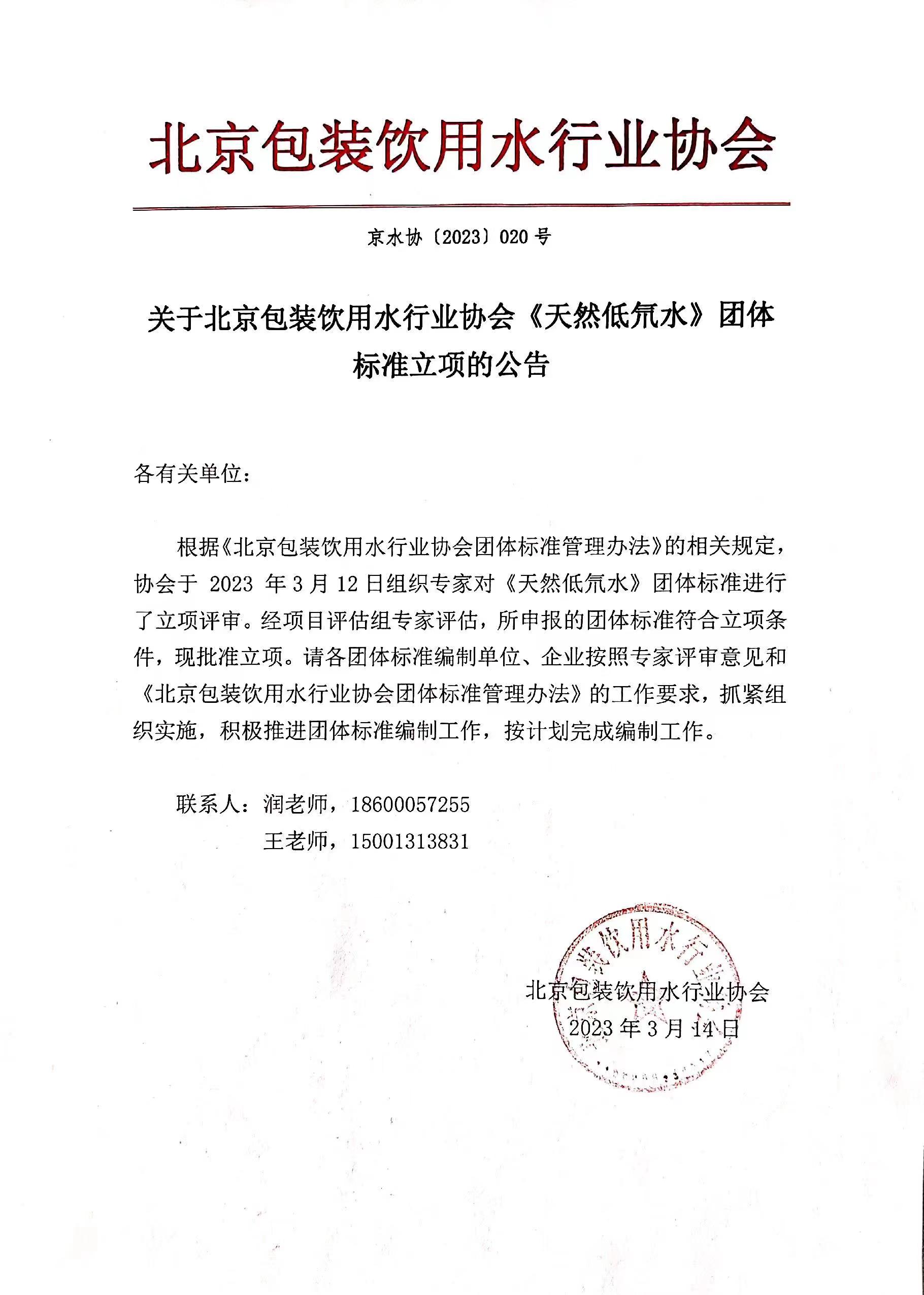 各有关单位: 根据《北京包装饮用水行业协会团体标准管理办法》的相关规定,协会于 2023 年3月12日组织专家对《天然低氘水》团体标准进行了立项评审。经项目评估组专家评估,所申报的团体标准符合立项条件,现批准立项。请各团体标准编制单位、企业按照专家评审意见和《北京包装饮用水行业协会团体标准管理办法》的工作要求,抓紧组织实施,积极推进团体标准编制工作,按计划完成编制工作。