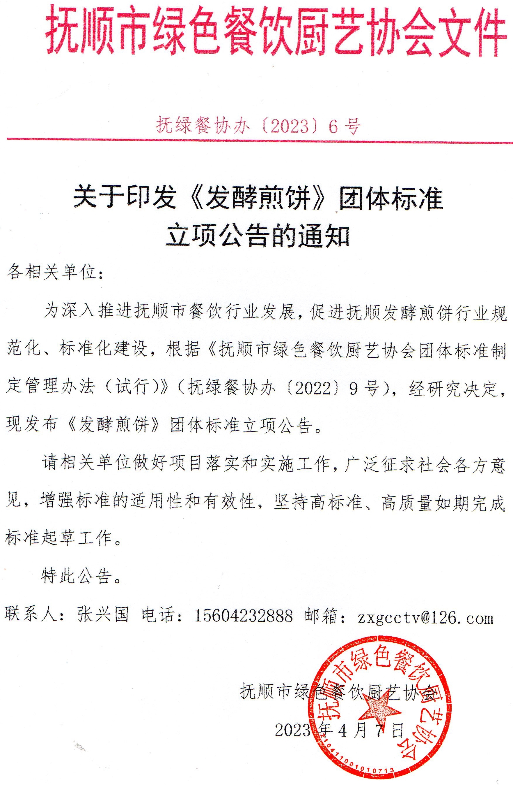 各相关单位: 为深入推进抚顺市餐饮行业发展,促进抚顺发酵煎饼行业规范化、标准化建设,根据《抚顺市绿色餐饮厨艺协会团体标准制定管理办法(试行)》(抚绿餐协办〔2022〕9号),经研究决定,现发布《发酵煎饼》团体标准立项公告。 请相关单位做好项目落实和实施工作,广泛征求社会各方意见,增强标准的适用性和有效性,坚持高标准、高质量如期完成标准起草工作。 特此公告。 联系人:张兴国 电话:15604232888 邮箱:zxgcctv@126.com