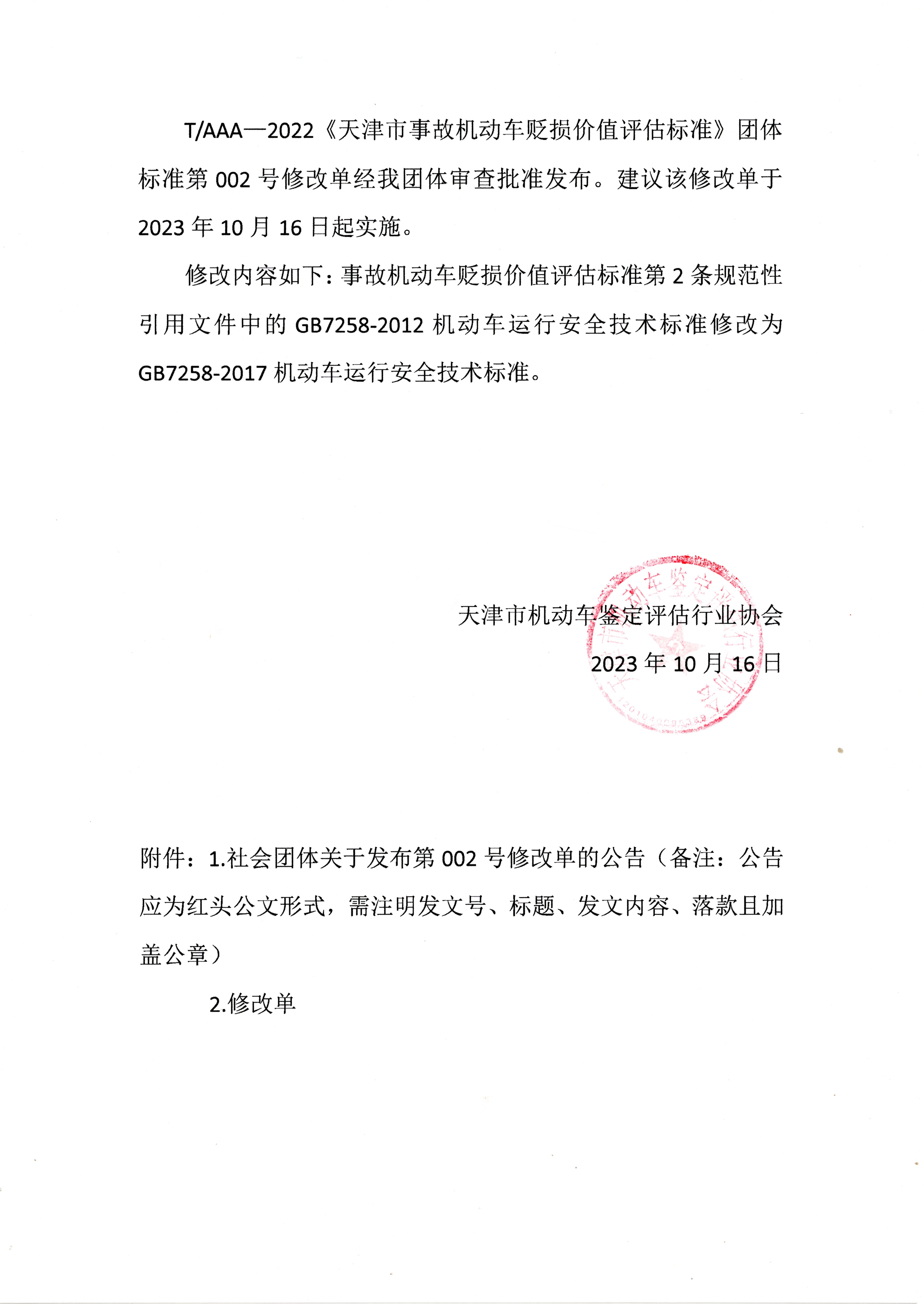 T/AAA—2022《天津市事故机动车贬损价值评估标准》团体标准第002号修改单经我团体审查批准发布。建议该修改单于2023年10月16日起实施。 修改内容如下:事故机动车贬损价值评估标准第2条规范性引用文件中的GB7258-2012机动车运行安全技术标准修改为GB7258-2017机动车运行安全技术标准。