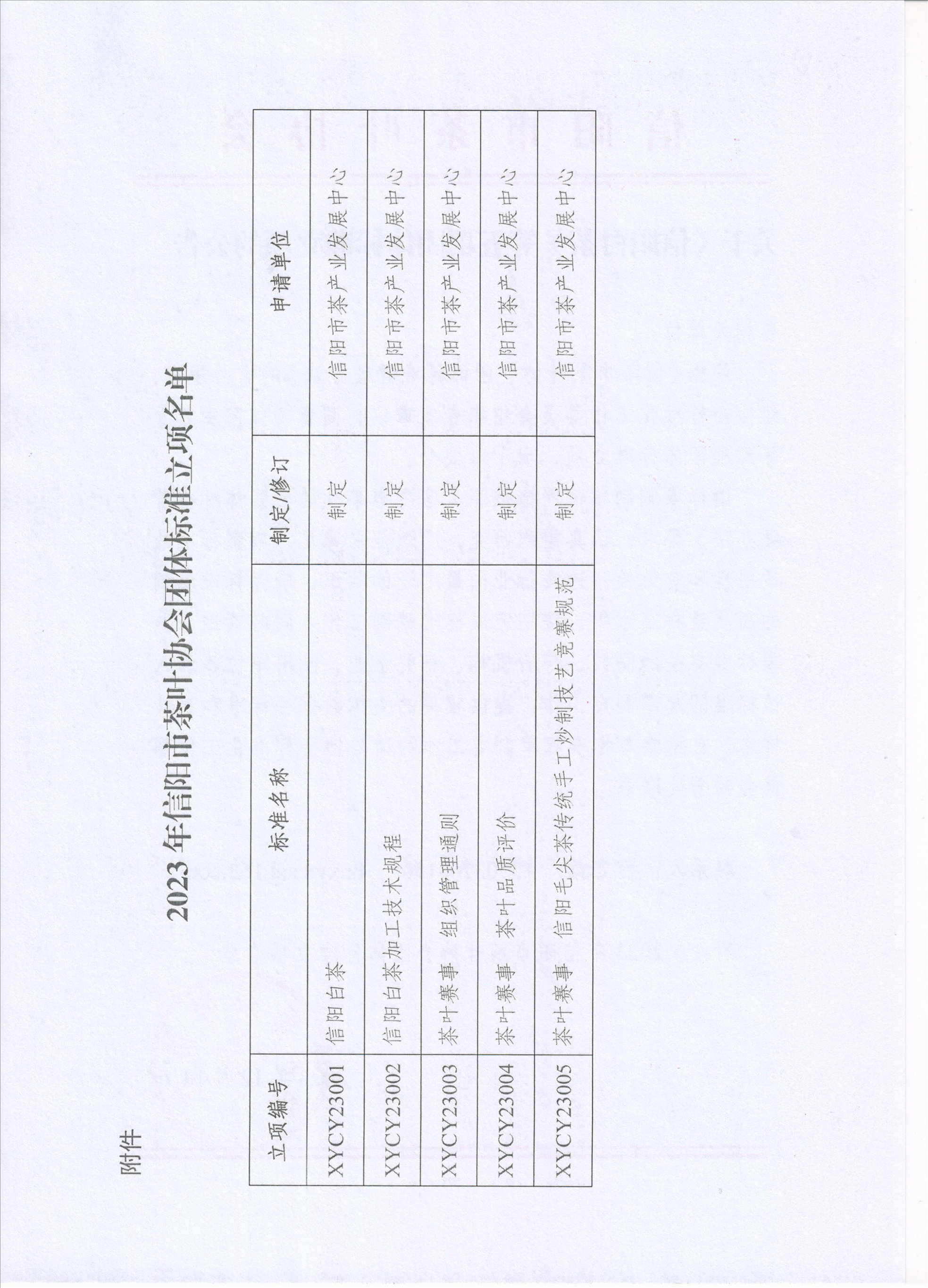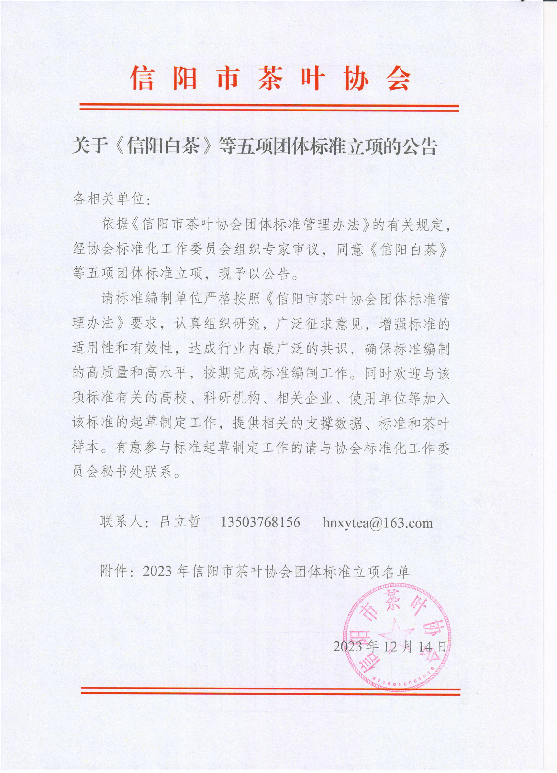各相关单位: 依据《信阳市茶叶协会团体标准管理办法》的有关规定,经协会标准化工作委员会组织专家审议,同意《信阳白茶》等五项团体标准立项(详见附件),现予以公告。 请标准编制单位严格按照《信阳市茶叶协会团体标准管理办法》要求,认真组织研究,广泛征求意见,增强标准的适用性和有效性,达成行业内最广泛的共识,确保标准编制的高质量和高水平,按期完成标准编制工作。同时欢迎与该项标准有关的高校、科研机构、相关企业、使用单位等加入该标准的起草制定工作,提供相关的支撑数据、标准和茶叶样本。有意参与标准起草制定工作的请与协会标准化工作委员会秘书处联系。 联系人:吕立哲 13503768156 邮箱:hnxytea@163.com 附件:2023年信阳市茶叶协会团体标准立项名单