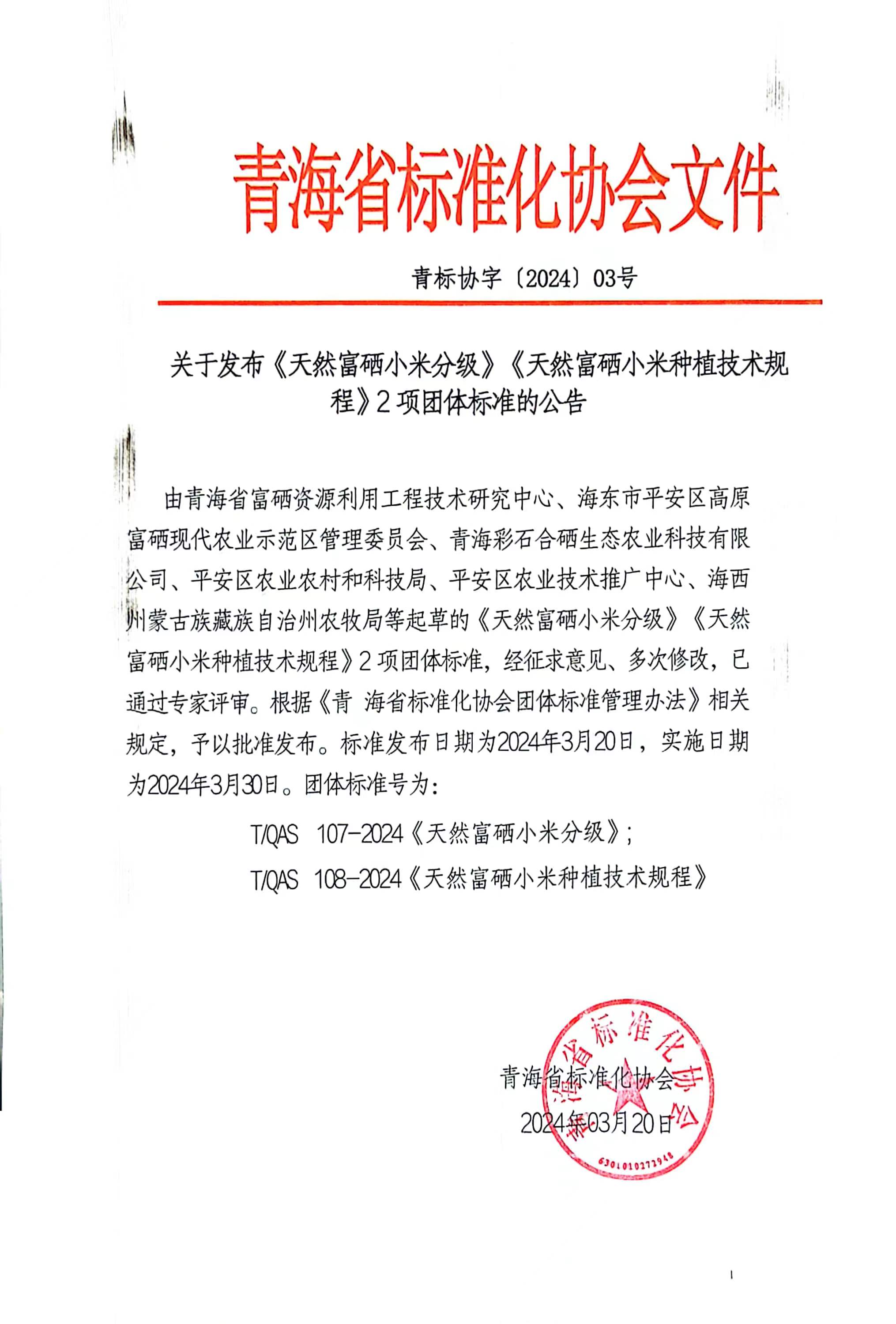 由青海省富硒资源利用工程技术研究中心、海东市平安区高原富硒现代农业示范区管理委员会、青海彩石合硒生态农业科技有限公司、平安区农业农村和科技局、平安区农业技术推广中心、海西州蒙古族藏族自治州农牧局等起草的《天然富硒小米分级》《天然富硒小米种植技术规程》2 项团体标准,经征求意见、多次修改,已通过专家评审。根据《青 海省标准化协会团体标准管理办法》相关规定,予以批准发布。标准发布日期为2024年3月20日,实施日期为2024年3月30日。团体标准号为: T/QAS 107-2024《天然富硒小米分级》 T/QAS 108-2024《天然富硒小米种植技术规程》