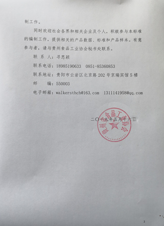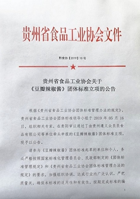 根据《贵州省食品工业协会团体标准管理办法的规定》,贵州省食品工业协会团体标准领导小组于2019年05月16日,组织相关专家,在贵阳审议通过了由贵州遵义众员员食品有限公司等单位牵头申报的《豆瓣辣椒酱》团体标准立项,现予以公告。 请参与《豆瓣辣椒酱》团体标准起草的单位和个人,务必严格按照国家标准化管理委员会、民政部制定的《团体标准管理规定》和《贵州省食品工业协会团体标准管理办法的规定》的要求,加强组织协调,达成行业内广泛认识,严把质量关,确保本标准的适用性和有效性,按期完成标准的编制工作。 同时欢迎社会各界和相关企业及个人,积极参与本标准的编制工作,提供相关的产品数据、标准和产品样本。有意参与者,请与贵州食品工业协会秘书处联系。 联 系 人:寻思颖 联系电话:18985190633 0851-85360853 联系地址:贵阳市云岩区北京路202号京瑞宾馆5楼 邮 编:550003 电子邮箱:walkersthch@163.com 1311141958@qq.com