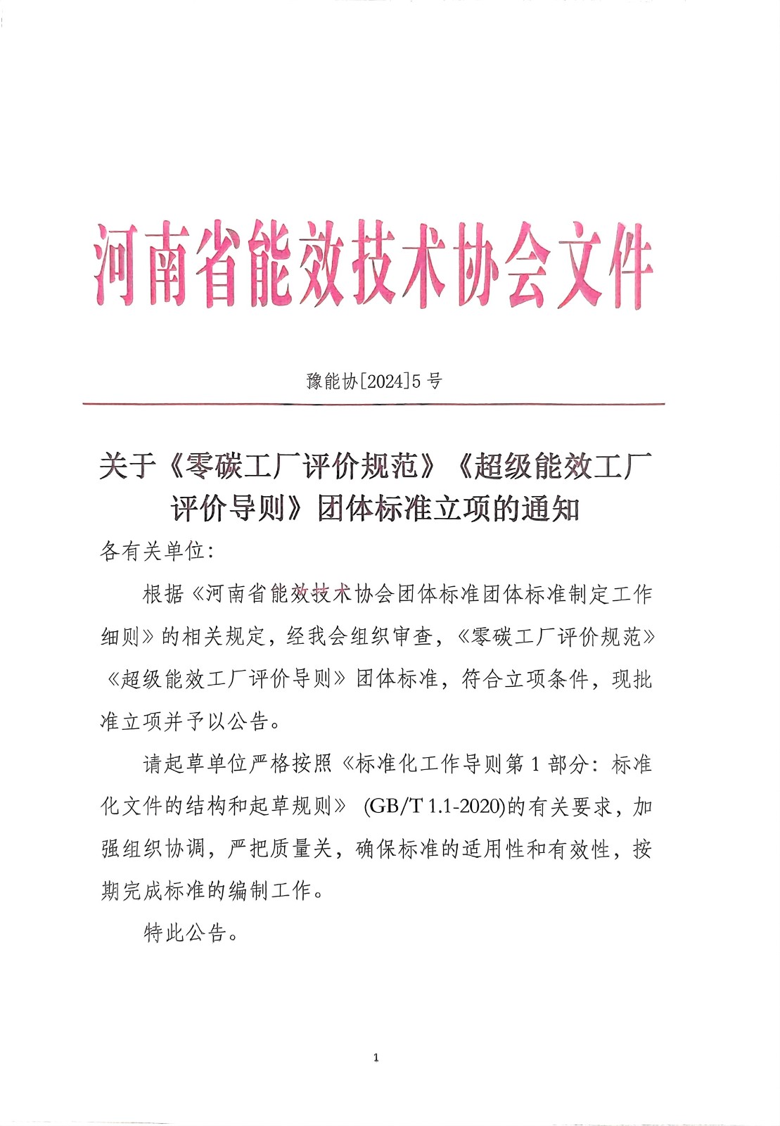 河南省能效技术协会关于《零碳工厂评价规范》、《超级能效工厂评价导则》团体标准立项的通知
