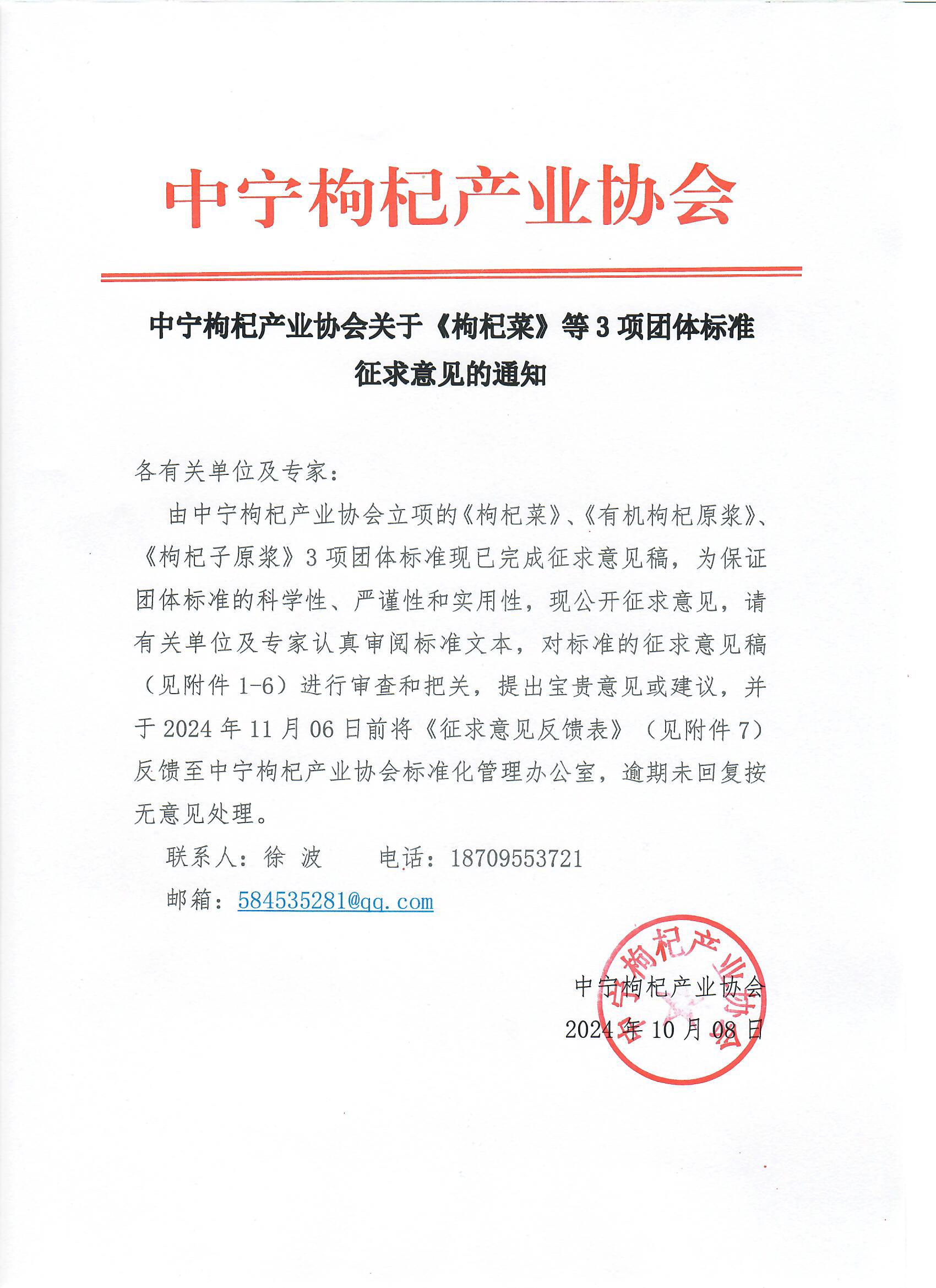 各有关单位及专家: 由中宁枸杞产业协会立项的《枸杞菜》、《有机枸杞原浆》、《枸杞子原浆》3项团体标准现已完成征求意见稿,为保证团体标准的科学性、严谨性和实用性,现公开征求意见,请有关单位及专家认真审阅标准文本,对标准的征求意见稿(见附件1-6)进行审查和把关,提出宝贵意见或建议,并于2024年11月06日前将《征求意见反馈表》(见附件7)反馈至中宁枸杞产业协会标准化管理办公室,逾期未回复按无意见处理。 联系人:徐 波 电话:18709553721
