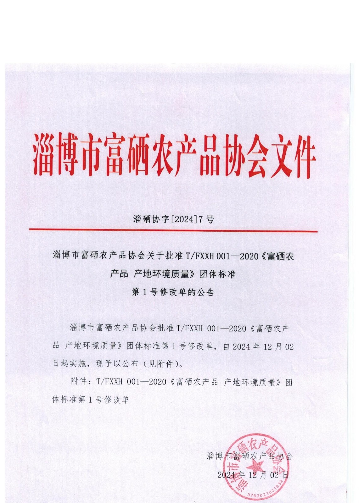 T/FXXH 001—2020《富硒农产品 产地质量环境》团体标准第1号修改单经我团体审查批准发布。建议该修改单于2024年12月02日起实施。 修改单见附件。