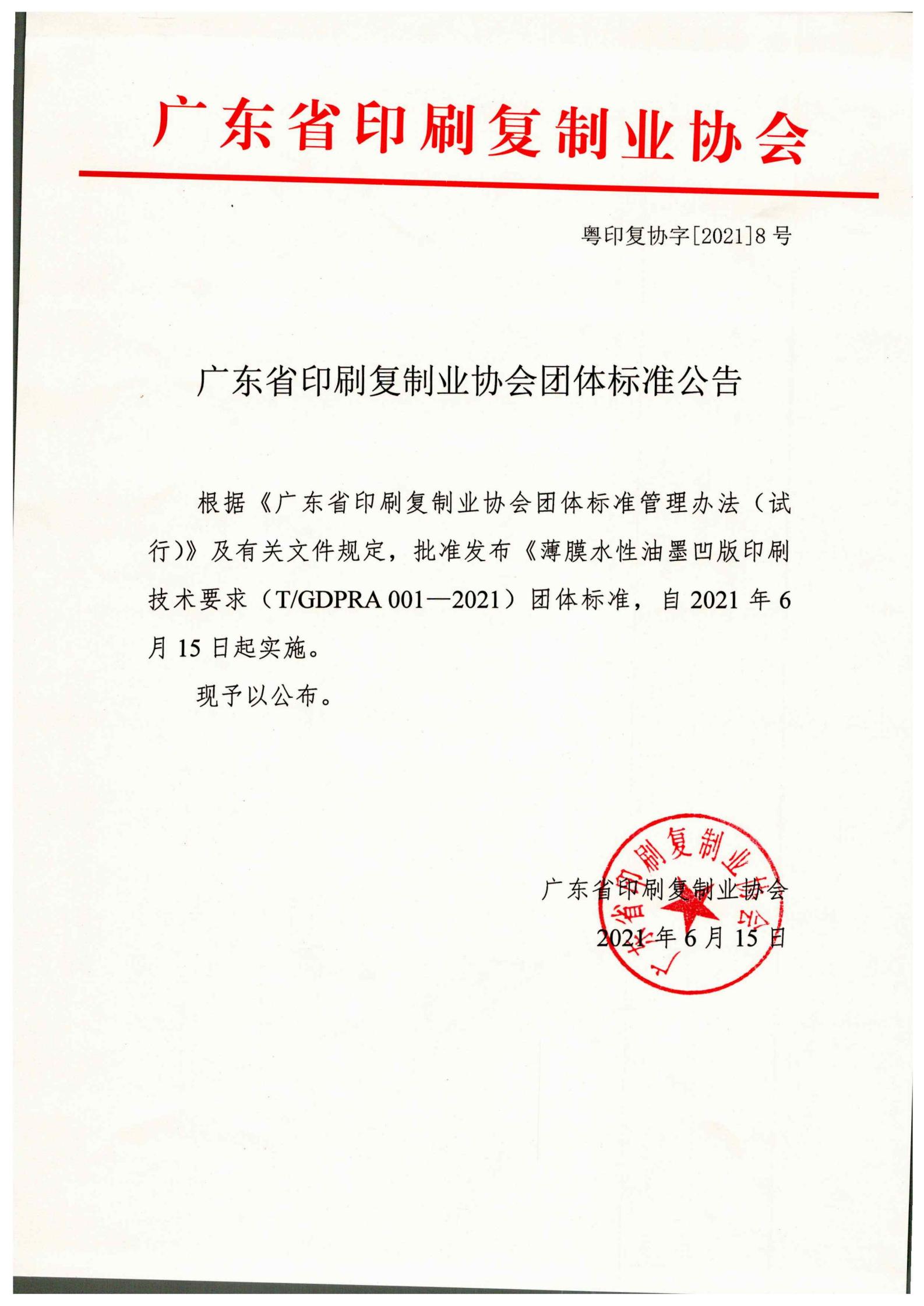 根据《广东省印刷复制业协会团体标准管理办法(试行)》及有关文件规定,批准发布《薄膜水性油墨凹版印刷技术要求(T/GDPRA 001—2021)团体标准,自2021年6月15日起实施。 现予以公布。