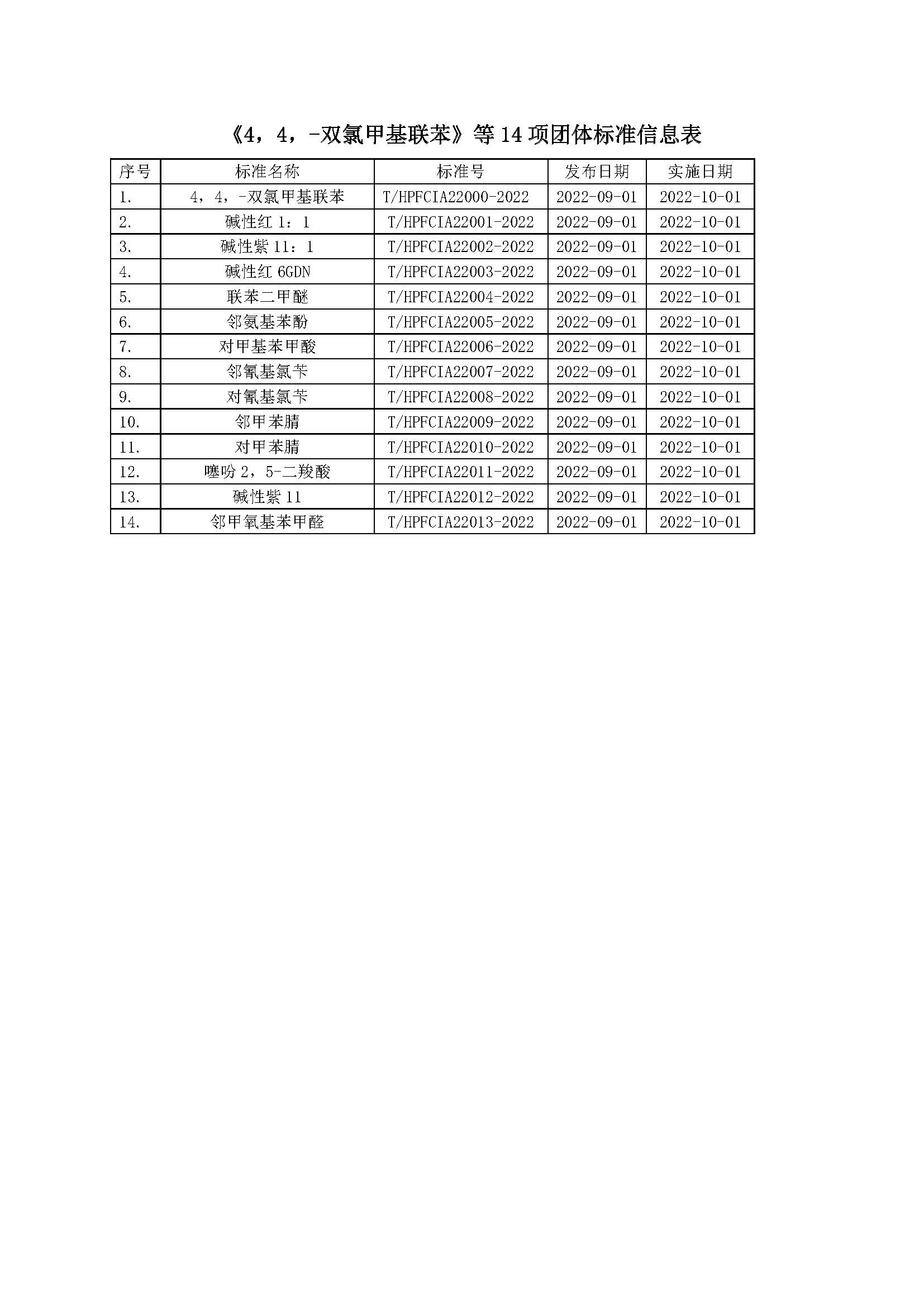各会员单位和相关企业: 按照《河北省精细化工行业协会团体标准管理办法》的有关规定,协会标准化管理委员会组织专家对《4,4,-双氯甲基联苯》等14项团体标准进行了评审,专家组同意标准通过审查,现批准发布(具体信息见附件),该14项标准于2022年10月1日生效。 特此公告。 附件:《4,4,-双氯甲基联苯》等14项团体标准信息
