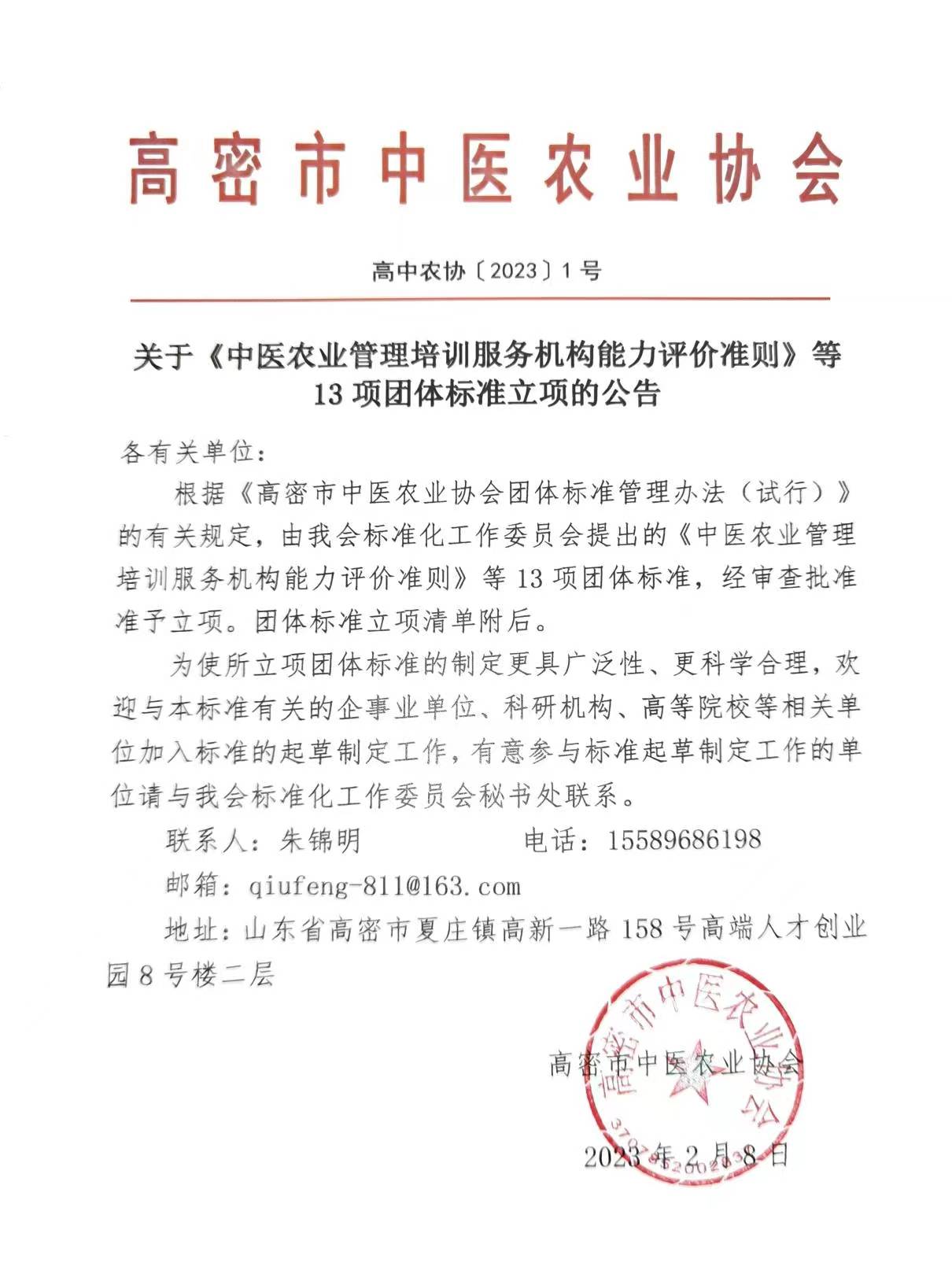 各有关单位: 根据《高密市中医农业协会团体标准管理办法(试行)》的有关规定,由我会标准化工作委员会提出的《中医农业管理培训服务机构能力评价准则》等13项团体标准,经审查批准准予立项。团体标准立项清单附后。 为使所立项团体标准的制定更具广泛性、更科学合理,欢迎与本标准有关的企事业单位、科研机构、高等院校等相关单位加入标准的起草制定工作,有意参与标准起草制定工作的单位请与我会标准化工作委员会秘书处联系。 联系人:朱锦明 电话:15589686198 邮箱:qiufeng-811@163.com 地址:山东省高密市夏庄镇高新一路158号高端人才创业园8号楼二层