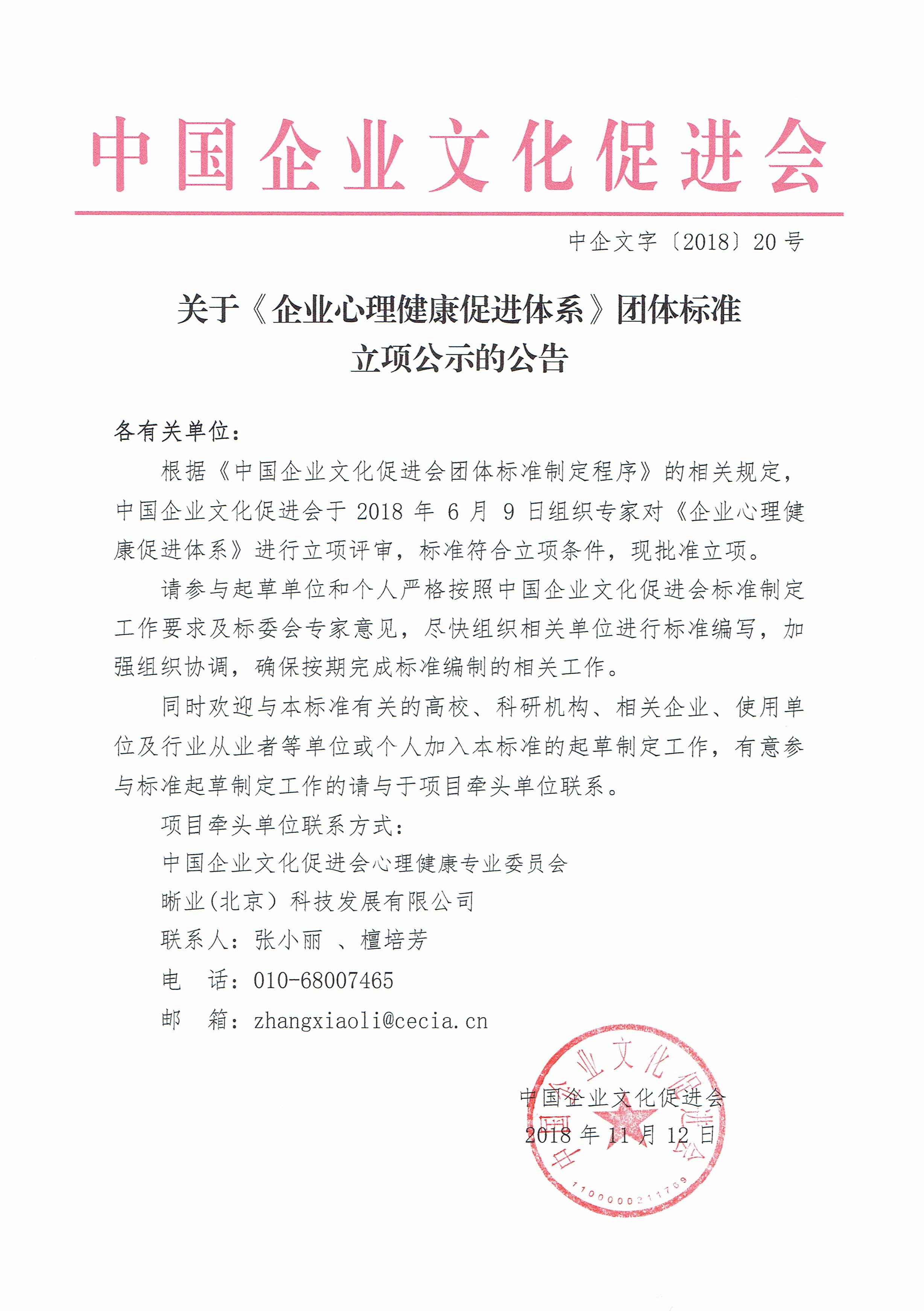 中国企业文化促进会关于《企业心理健康促进体系》团体标准立项公示的公告
