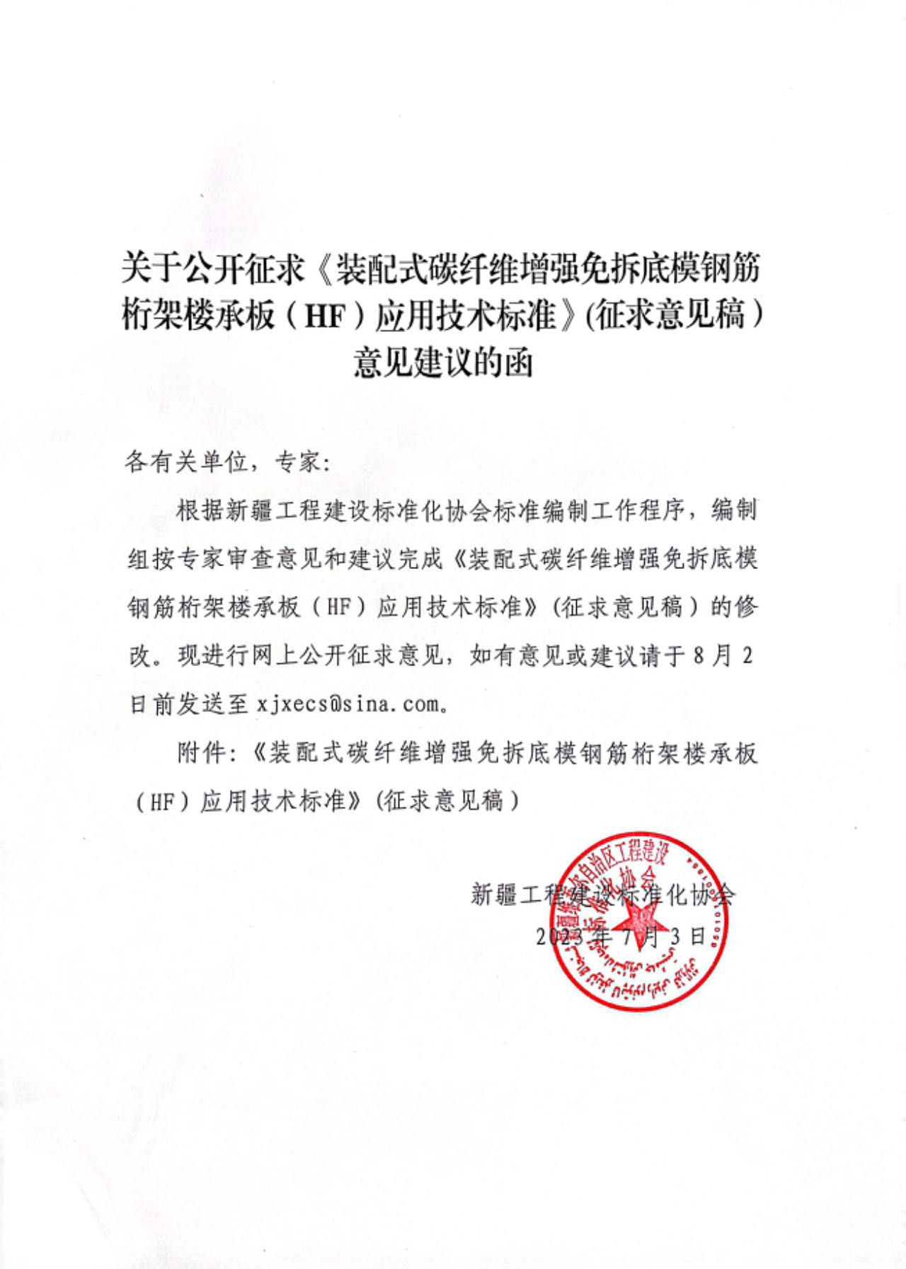 新疆工程建设标准化协会公开征求《装配式碳纤维增强免拆底模钢筋桁架楼承板(HF)应用技术标准》意见建议
