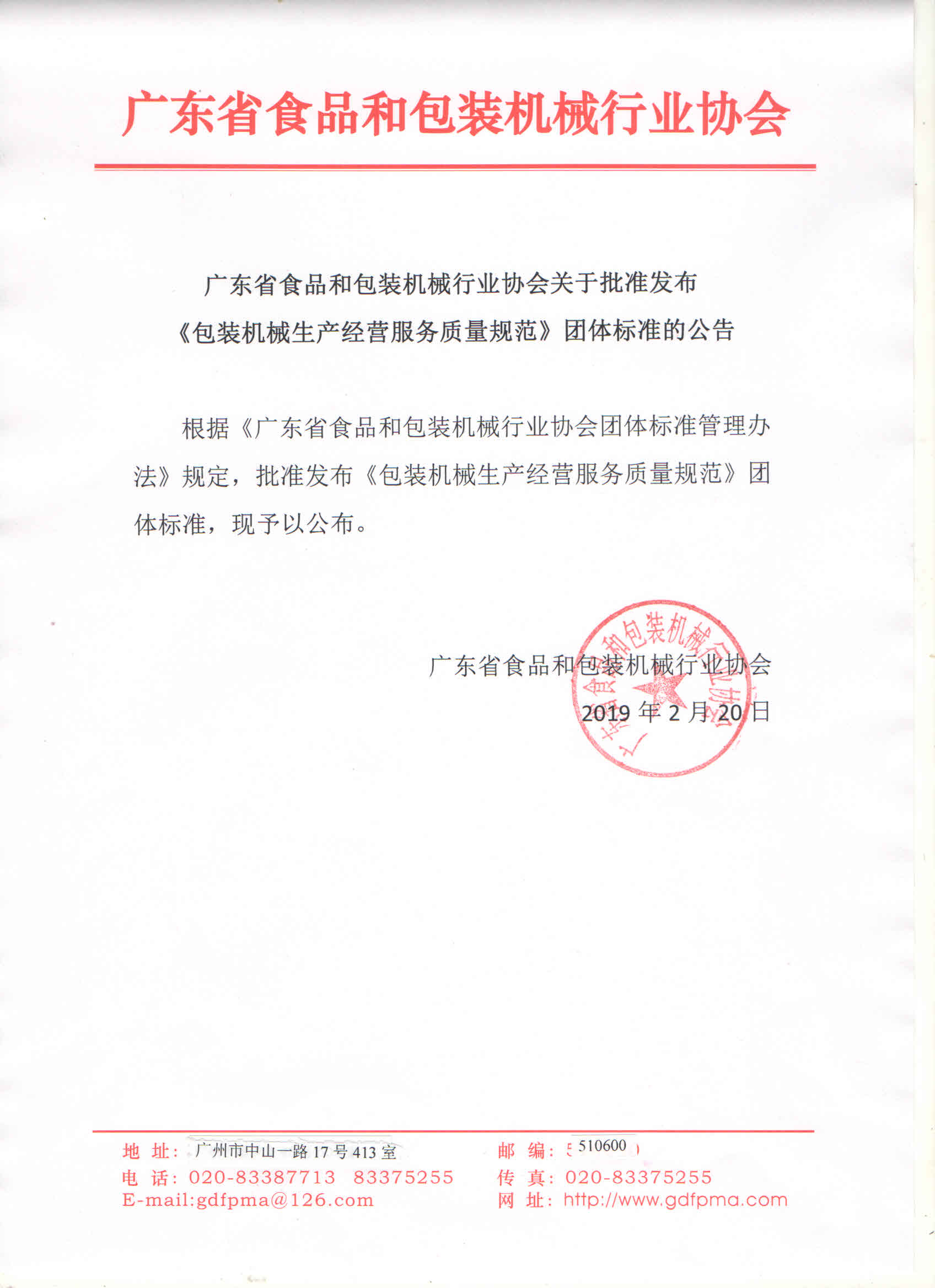 广东省食品和包装机械行业协会关于批准发布 《包装机械生产经营服务质量规范》团体标准的公告