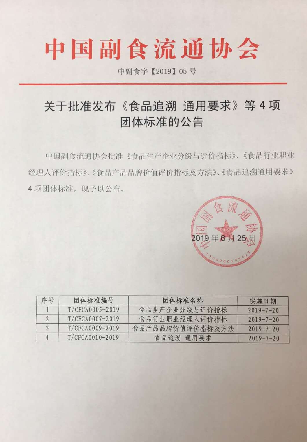 中国副食流通协会批准《食品生产企业分级与评价指标》《食品行业职业经理人评价指标》《食品产品品牌价值评价指标及方法》《食品追溯 通用要求》4项团体标准,现予以公布。